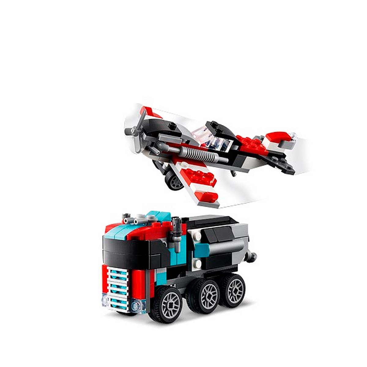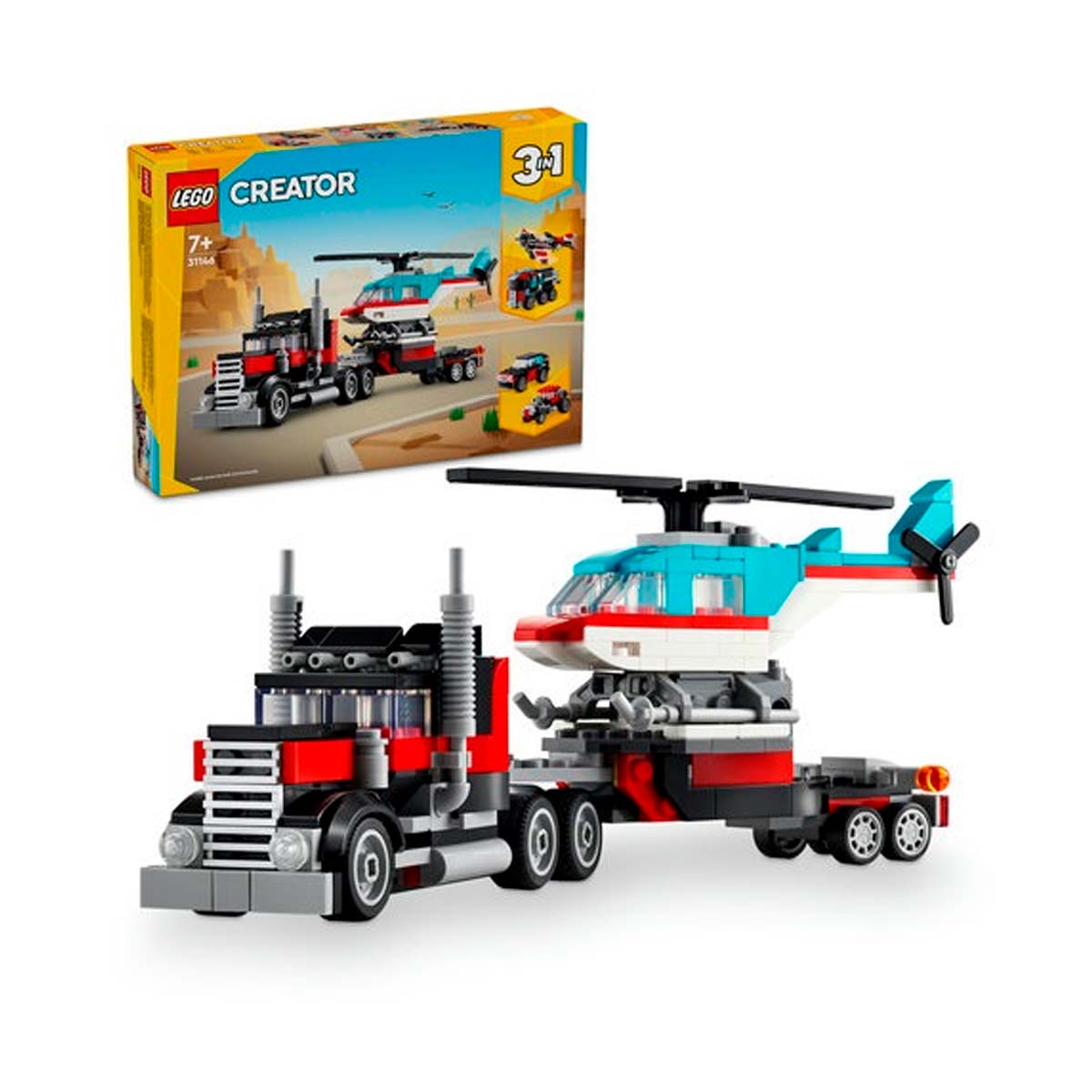 LEGO Creator 3-in-1 Platform Truck with Helicopter (31146). The set allows kids to use all 270 pieces to build a cool toy transporter truck with moving wheels that can transport a helicopter with moving rotor blades on its trailer.