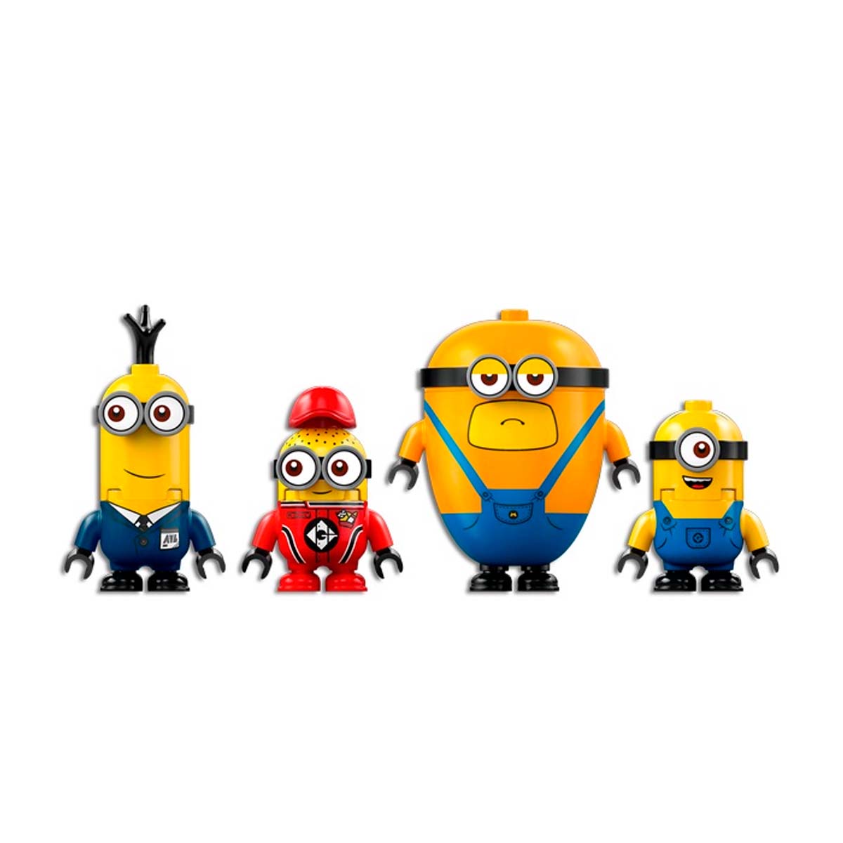 This 3-in-1 LEGO set includes 4 Minions, a small toy car and accessories. Check out the Minions banana car with driver's seat and detachable engine. Comes with 4 Minions and accessories. Mega Minion Dave can lift the engine with one hand and a weightlifting bar with the other. Mel paints a picture of a banana, while Secret Agent AVL Minion Tim flies with spinning blades on his head and a remote control in his hand. On the floor is his workstation, filled with special tools, including X-ray goggles. Pit Crew Minion Ron is in charge of changing nappies on the changing table. He has all the equipment, including a gun to dispose of dirty nappies.