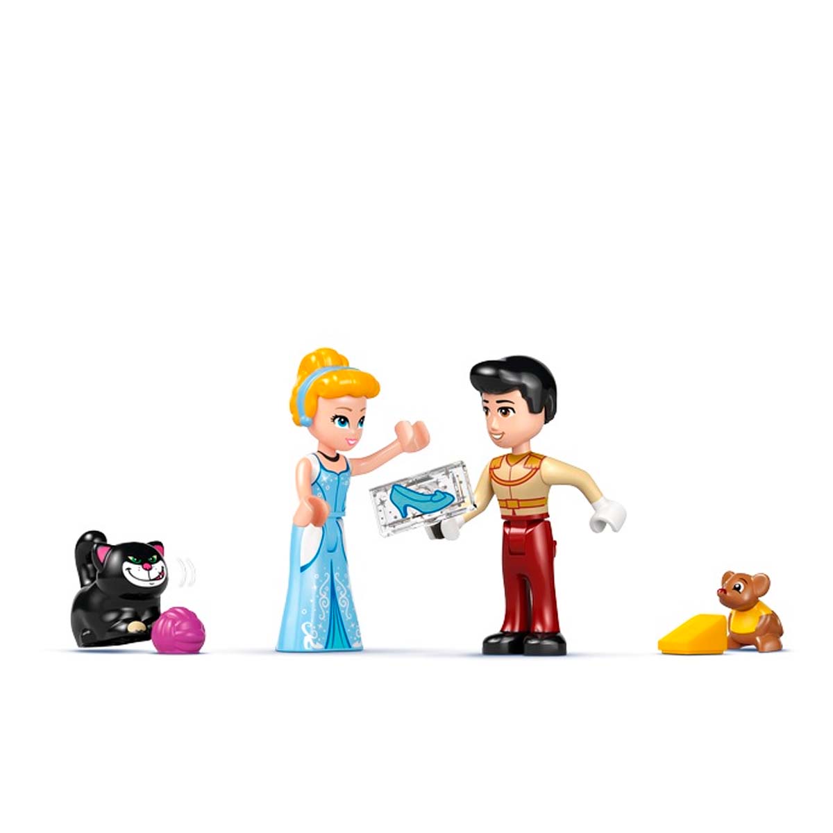 The 2-level castle set features a ballroom with revolving floor, a sewing room, and 3 upstairs bedrooms. Attached to the castle is a stable with hay and a saddle for the LEGO Disney horse figure. There's also a carriage with harness and space for Prince Charming and Cinderella, plus Lucifer and Gus animal figures.