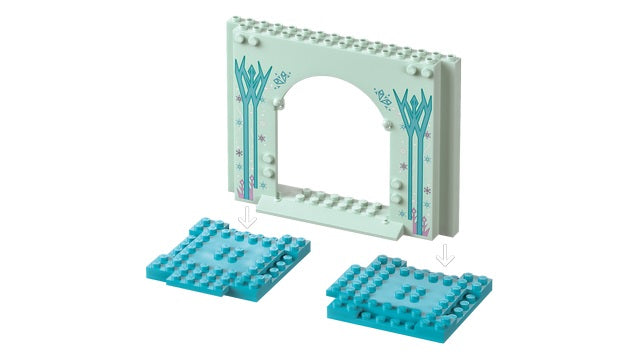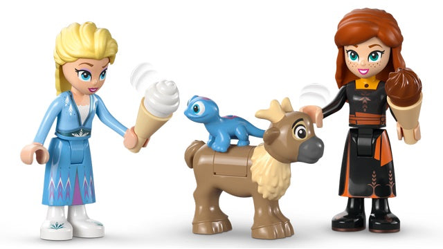 LEGO Disney Frozen Elsa's Frozen Castle (43238). Inside is a buildable toy Frozen castle for kids with a kitchen, fireplace, swing and slide, campfire, small ice canoe. Includes LEGO Disney Elsa and Anna mini-doll figures, plus buildable animal toys of Bruni and a baby reindeer.