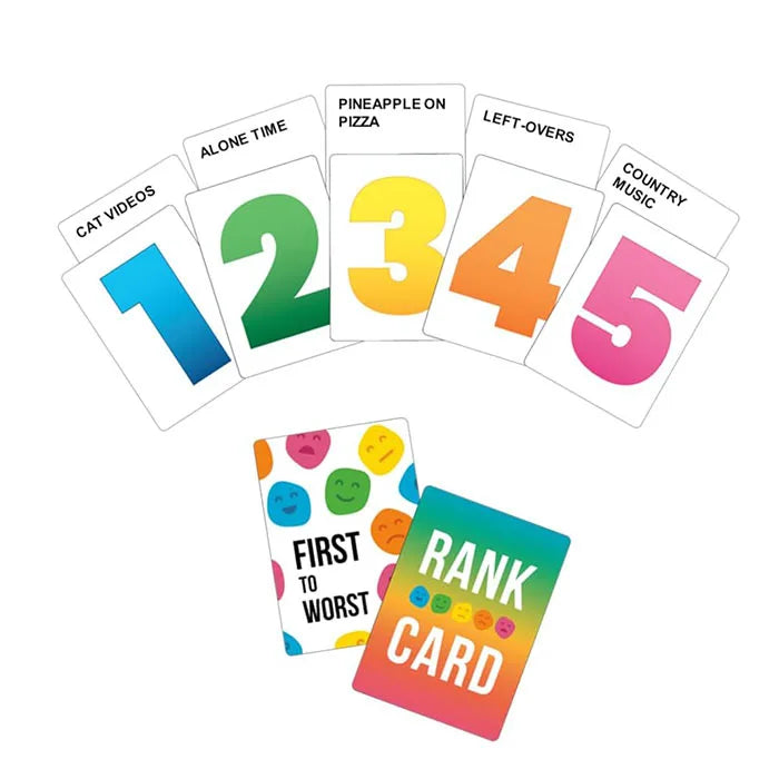 In this fun game, players try to get inside each other's heads by guessing how their fellow players classify a wide variety of interesting topics - pineapple on pizza? country music? cat videos? There are almost 300 topics in the game. Secretly rank five random things from 1 to 5. Then, as a team, the rest of the players try to guess the exact order chosen by THE RANKINGER. If you get more things right than wrong, you WIN the game. Includes 300 cards, notepad and rules.