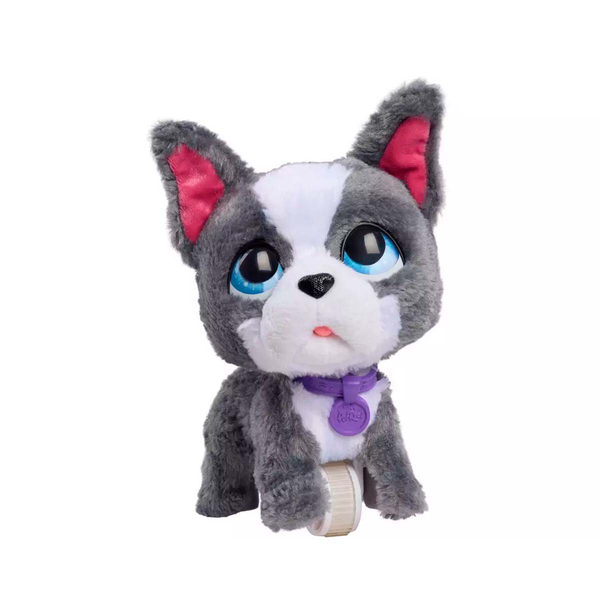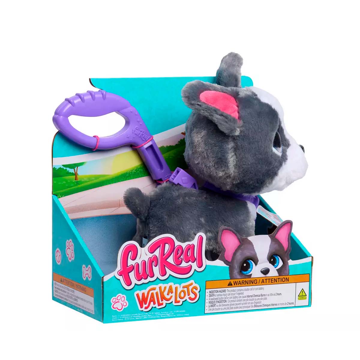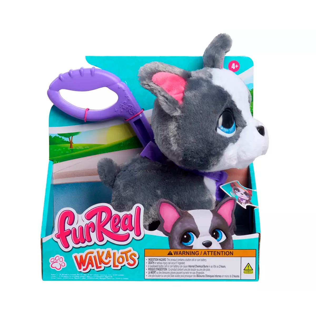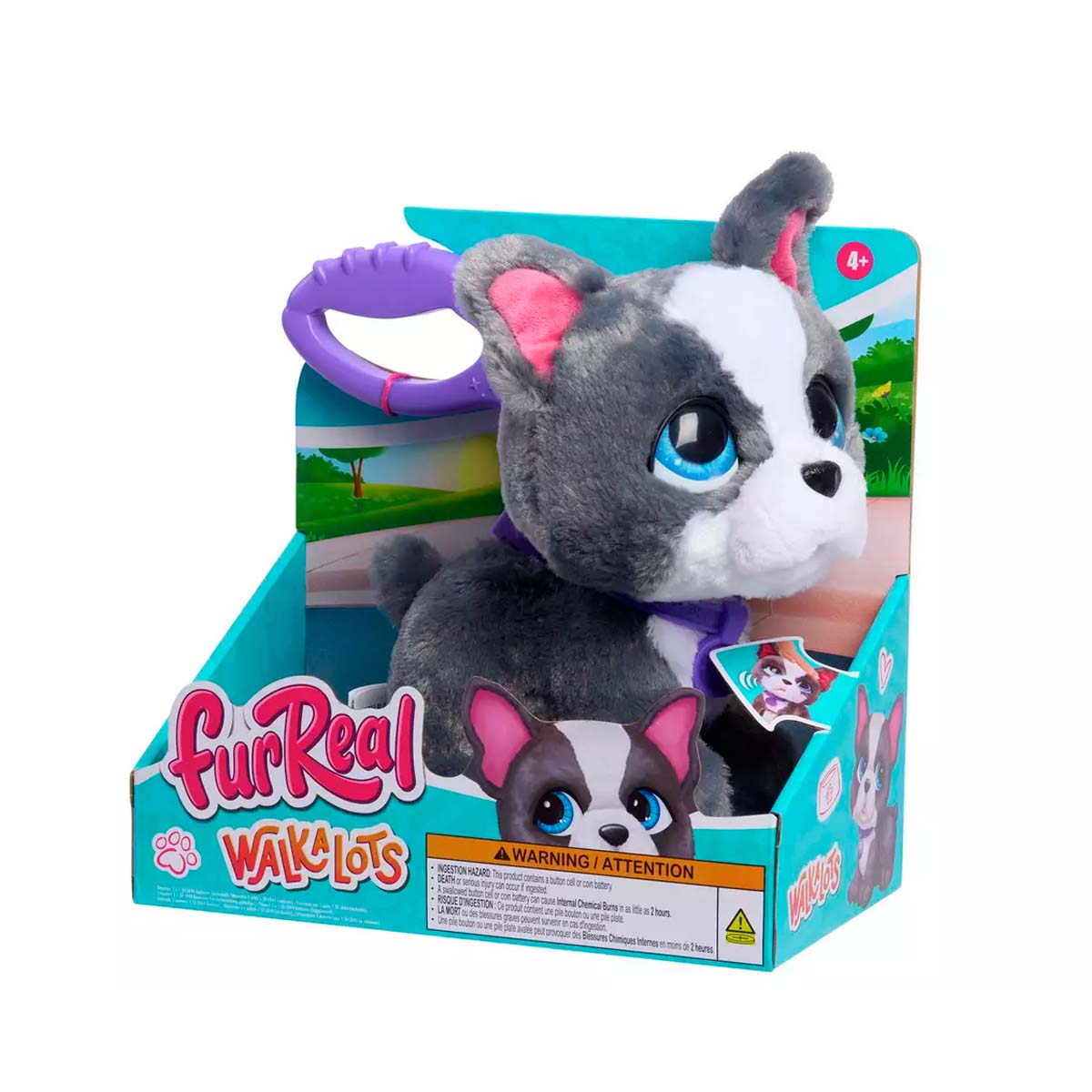 - Experience the joy of pet care with the FurReal Walk-A-Lot interactive French Bulldog toy. This cheerful French Bulldog toy has super-soft gray and white fur, bright blue eyes, and a cute purple collar.