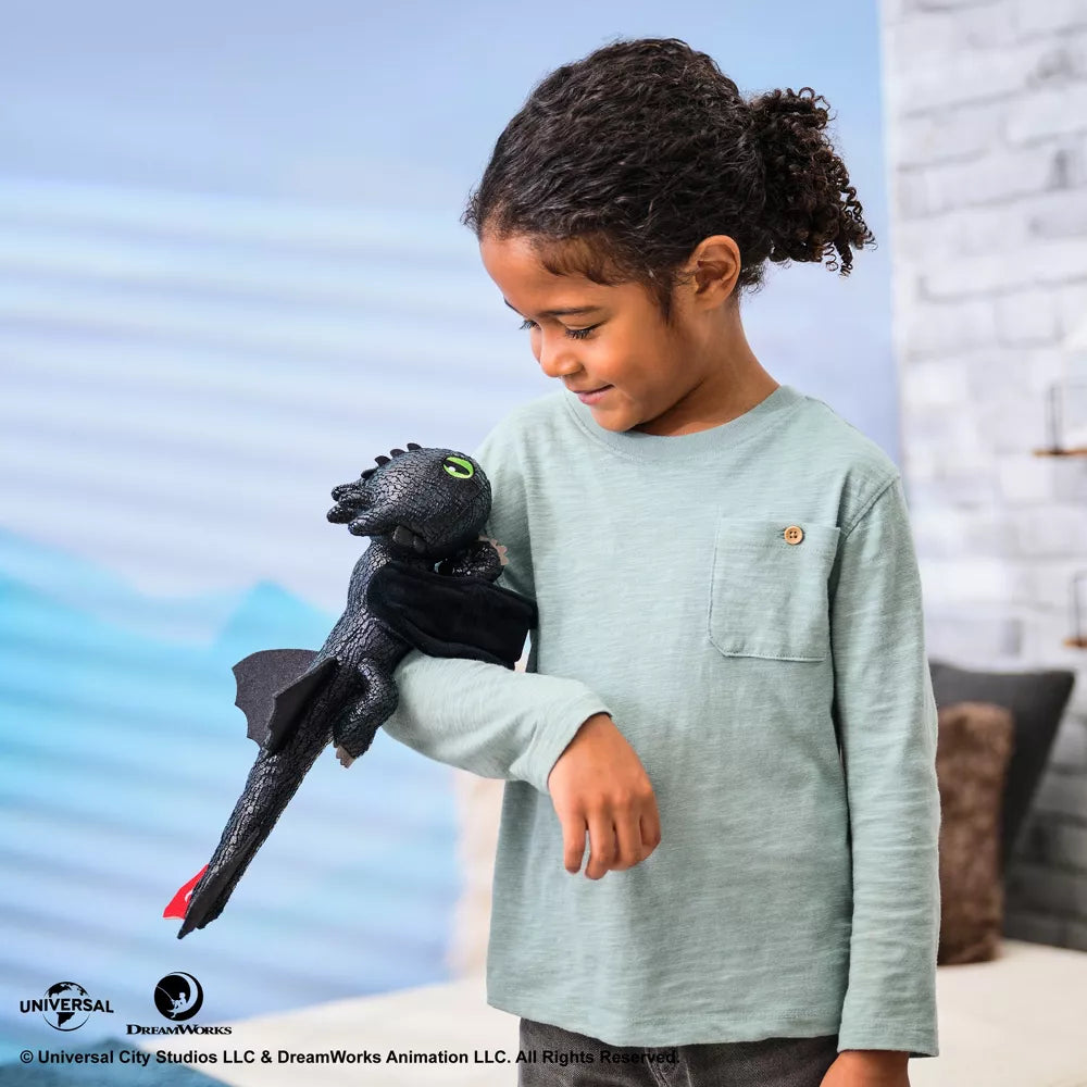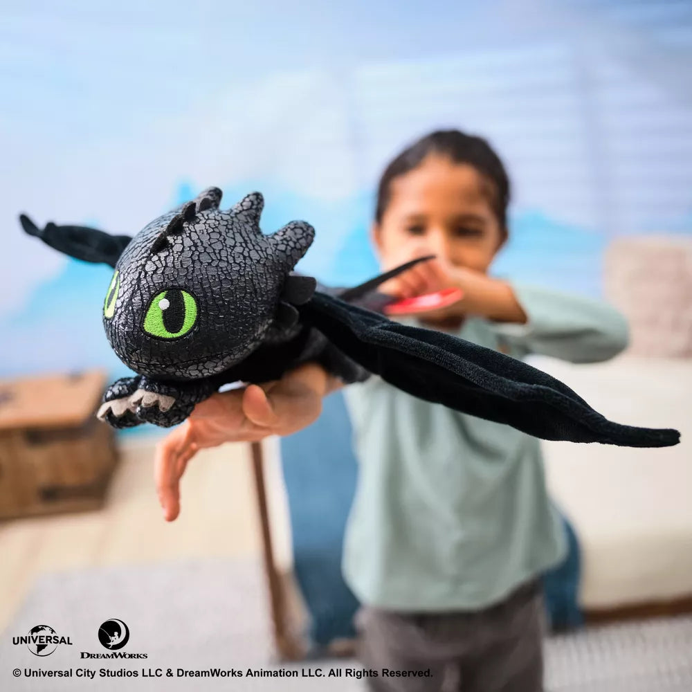 - 12” Toothless plush with shiny black scales, green embroidered eyes, and soft, curling wings