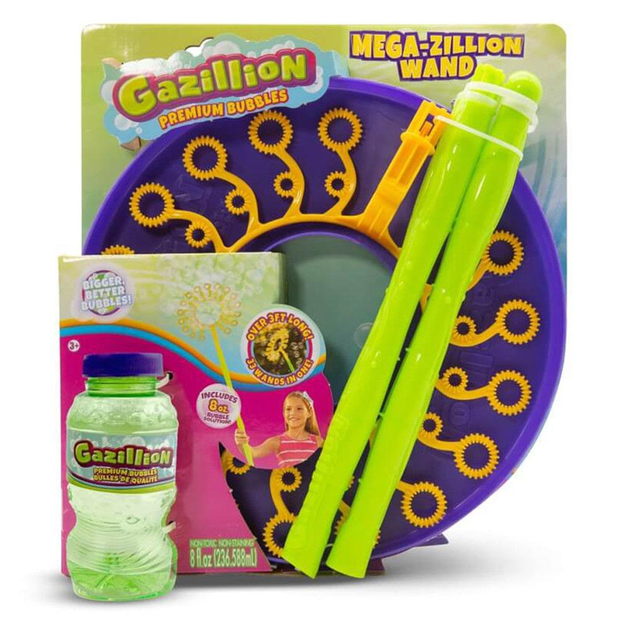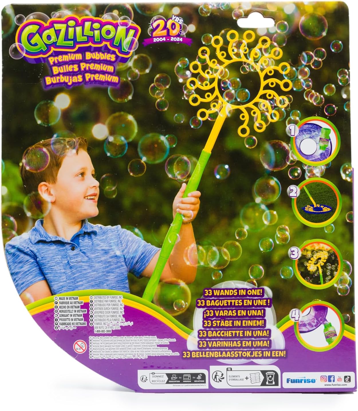The Gazillion Mega Zillion Wand is a giant bubble wand featuring 33 mini wands arranged in a circular tray with a 3‑ft flexible handle, allowing kids to effortlessly create zillions of bubbles with a simple wave. It includes two 8 oz bottles of Gazillion bubble solution and a spill‑smart tray with a spout for easy refill—perfect for outdoor fun for children aged 3 and up