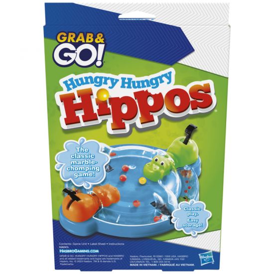 - Travel-size version of classic Hungry Hungry Hippos game for 2 players