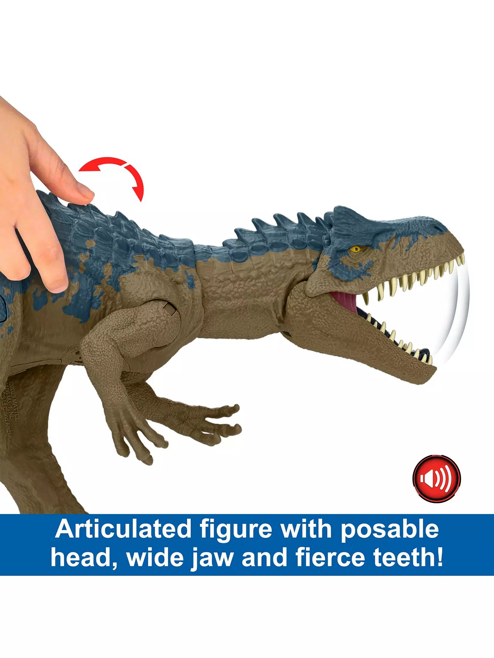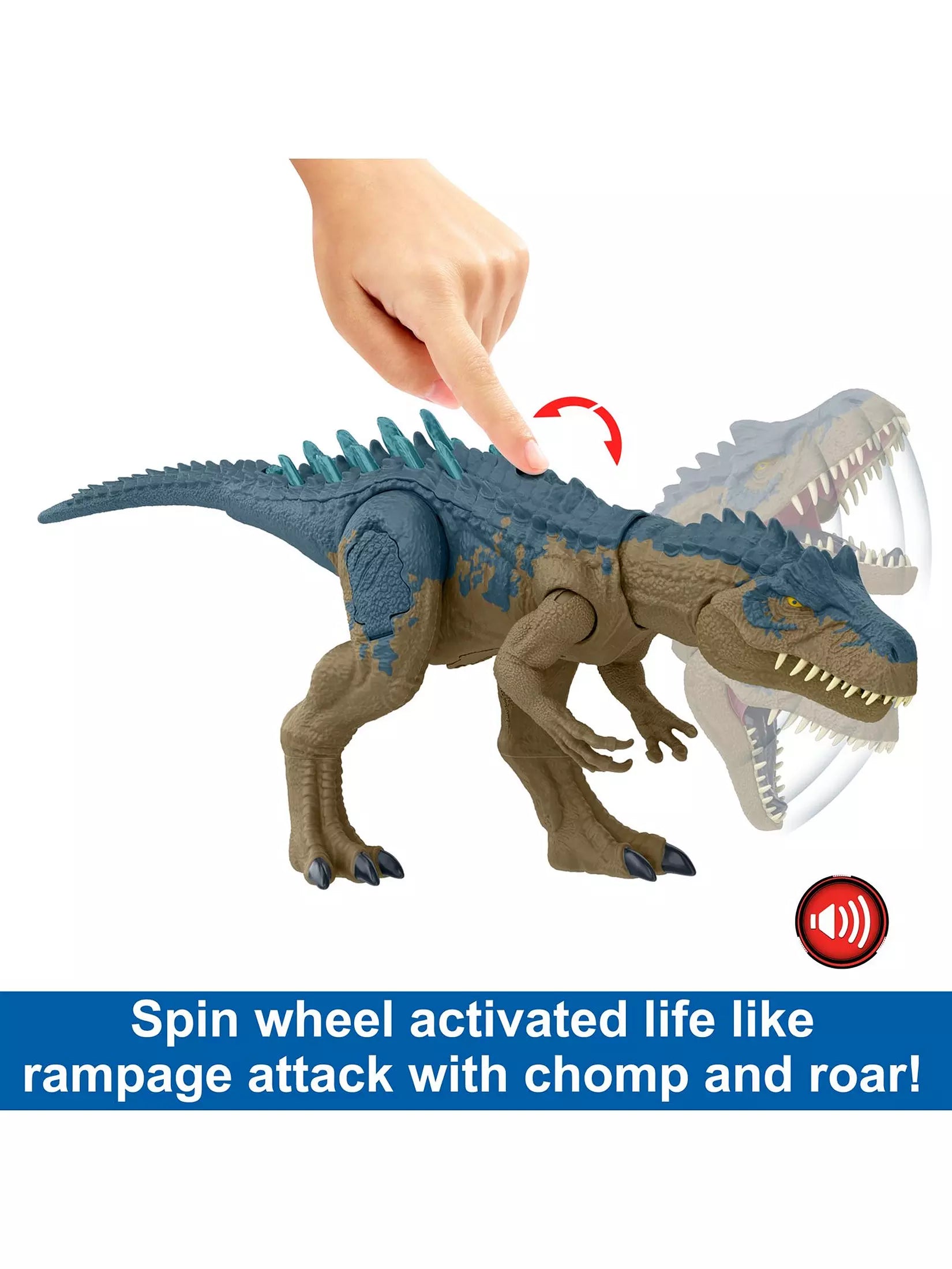 - 17-inch posable dinosaur with spin wheel that activates rampage attack and roar