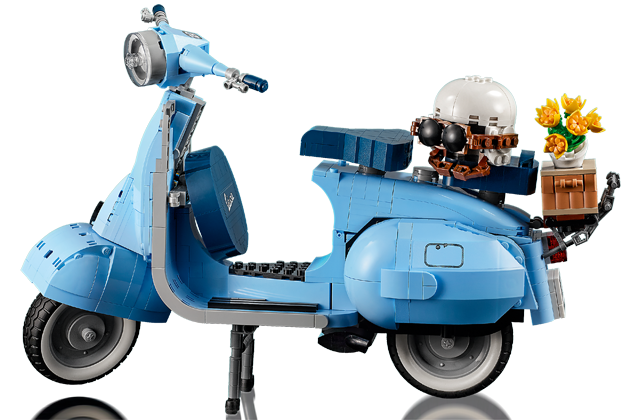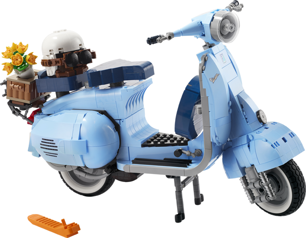 Inspired by the classic 1960's Piaggio Vespa in pastel blue. Contains side mounted front wheel, 2 seats, removable engine cover with brick engine underneath, working kickstand and working steering, Vespa logo, classic 60's Italian number plate, spare wheel, helmet and a basket with a bunch of flowers on the back.
