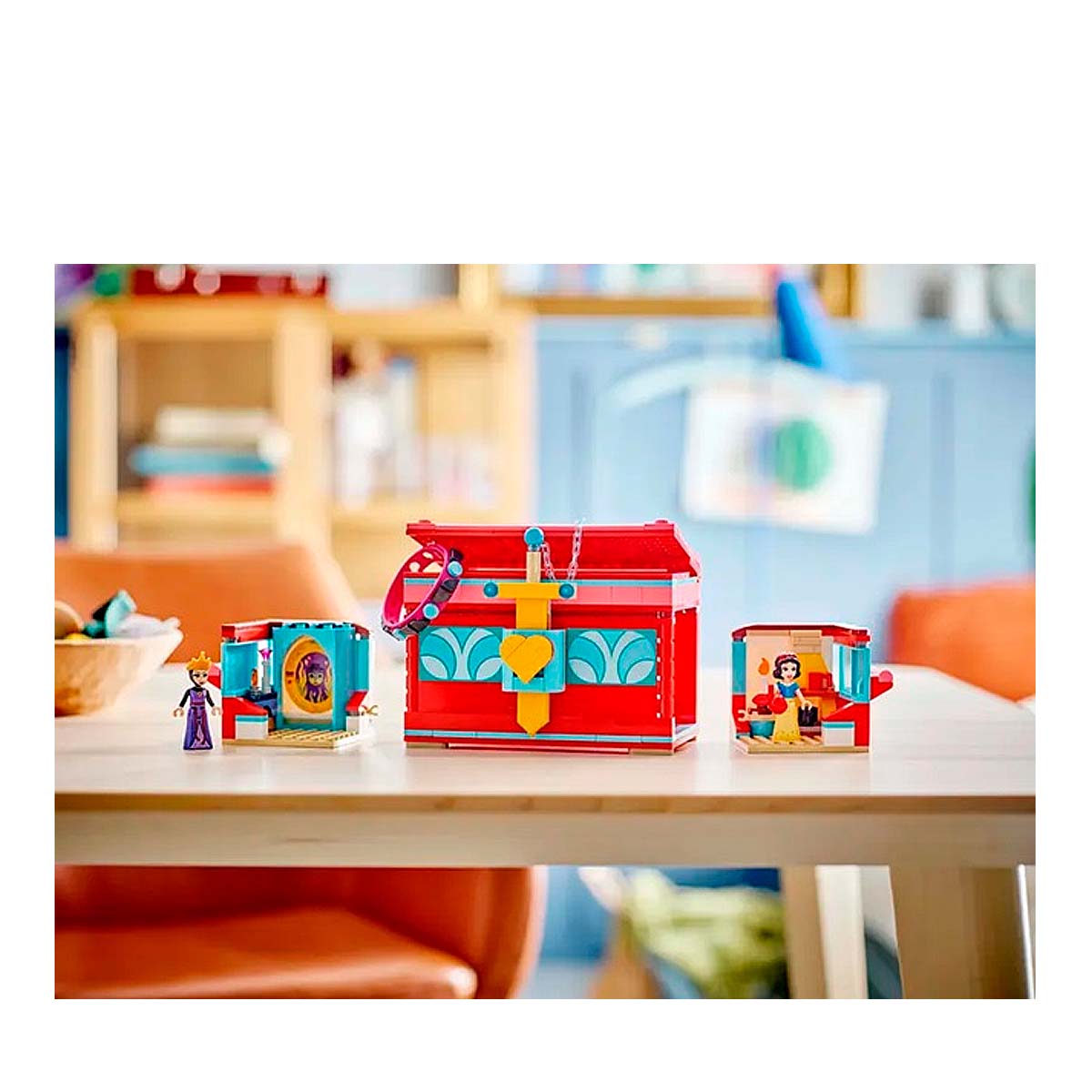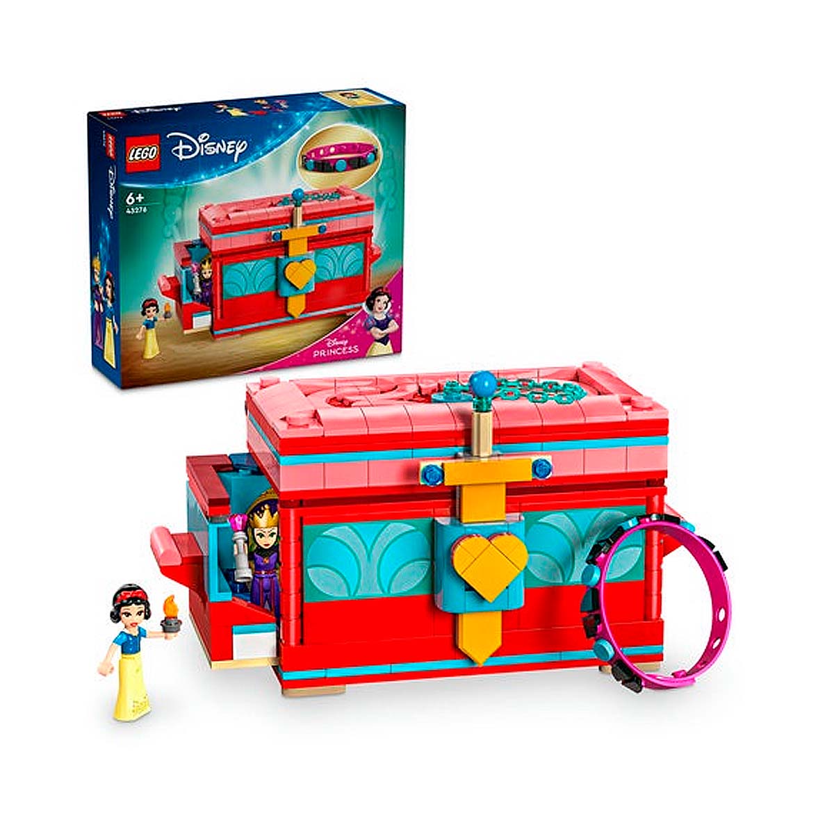 LEGO Disney Snow White Jewelry Box construction set (43276). Consists of a box with a hinged lid, handles on both sides and hidden cameras, a padlock with a sword on a chain, LEGO - Disney Snow White and the Evil Queen mini-dolls and a colorful bracelet with various elements to decorate, wear or share.
