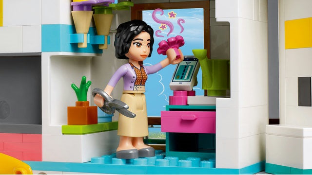 - Shopping centre playset – LEGO Friends Heartlake City Shopping Mall features 5 toy shops, 2 moveable escalators and 7 LEGO Friends characters