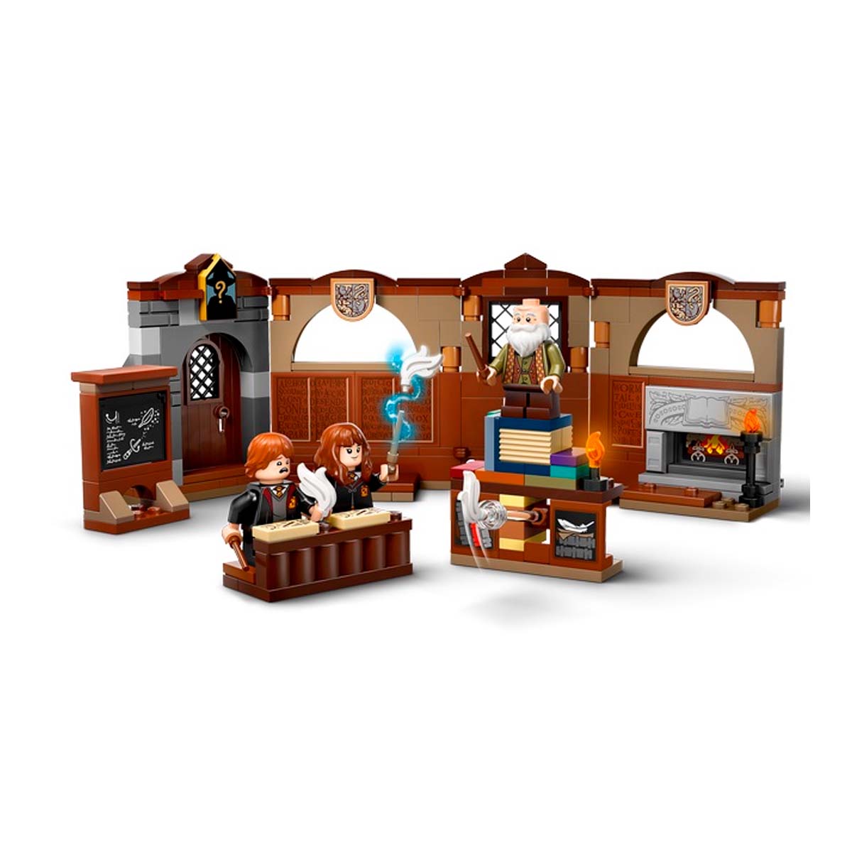 The buildable Hogwarts classroom in this Harry Potter playset folds out for easy play and features a Wingardium Leviosa feather-levitation function, detachable desks for the students, a detachable blackboard with spell instructions and more. This magical toy also includes LEGO Harry Potter minifigures - Ron Weasley, Hermione Granger and Professor Flitwick - to role-play unlimited imaginative stories.