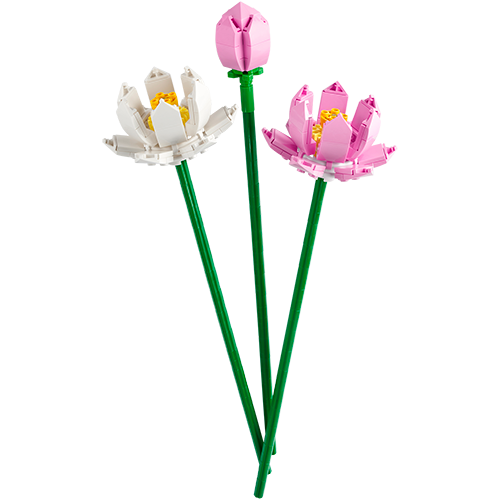 This flower depicts 2 Lotuses in full bloom, plus a flower head in bud, all in delicate shades of pink and white, with long green stems for vase display. This beautiful LEGO bouquet is a great gift idea for birthdays, holidays or any other day.