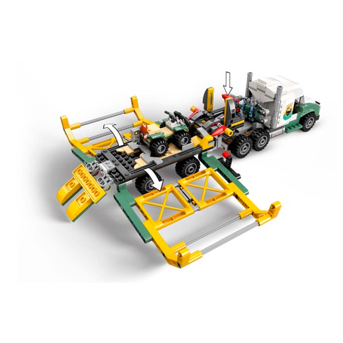 This set allows children to tell unlimited action stories with the moulded Allosaurus toy figure with movable legs, head and mouth, plus minifigures of Darius, Kenji, Yaz and the guard. There's a semi-trailer with opening roof and bonnet, a cab with bed for 3 minifigures, a cage trailer with front supports and opening rear ramp, a cage that opens at the push of a lever, a quad bike and a drone, plus plenty of elements to start a story.