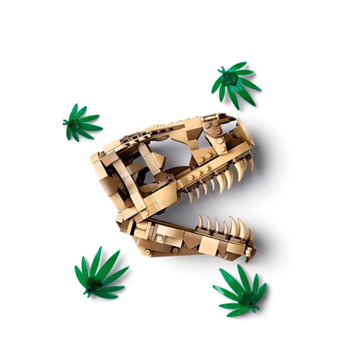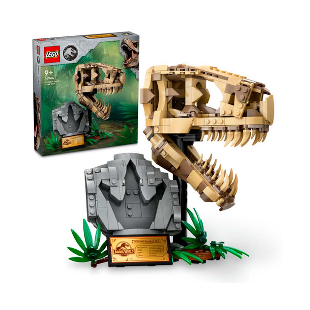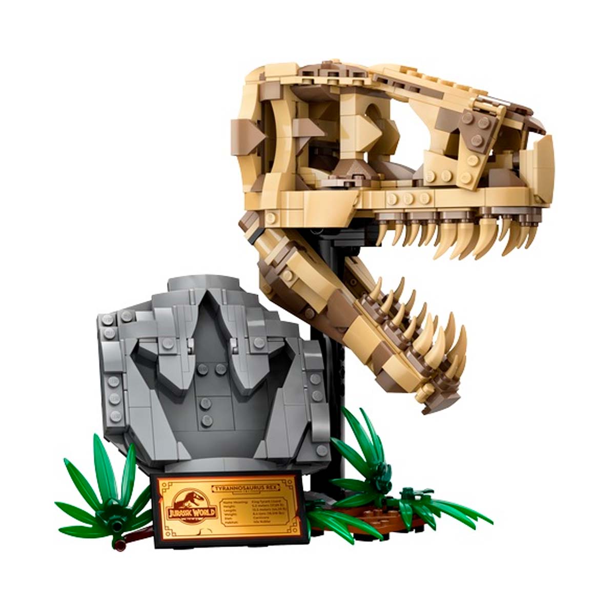 This LEGO Jurassic World Dinosaur Fossils: T. Rex Skull (76964). The first Jurassic World set made for display includes a skull with an opening jaw, an information plate stand, a piece of ‘amber’ hidden in the back of the model and a "fossilised" footprint