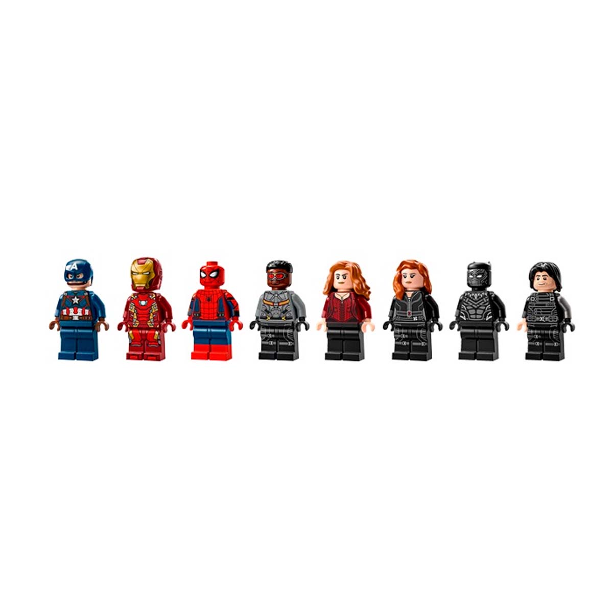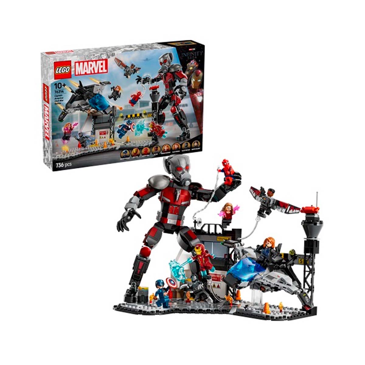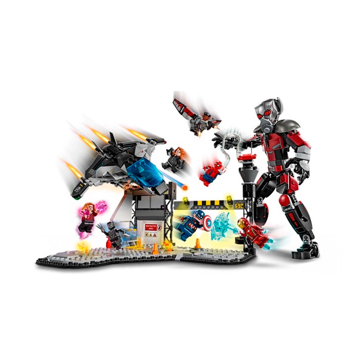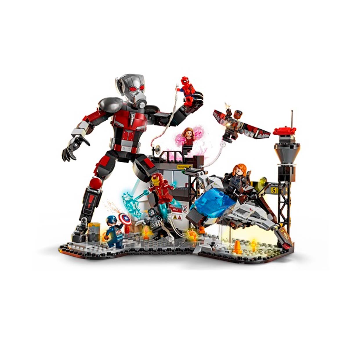 This Marvel building toy is based on the airport battle scene from Marvel Studios’ Captain America: Civil War. It includes eight LEGO Marvel minifigures: Captain America, Winter Soldier, Wanda, Falcon, Iron Man, Spider-Man, Black Widow, and Black Panther, with weapons and accessories, plus a fully jointed LEGO Marvel Ant-Man figure standing over 24 cm (9.5 in) tall. The Quinjet aircraft features foldable wings and an opening cockpit that seats a minifigure pilot. The battle action is further enhanced by an exploding barrel feature incorporated within the airport scenery.