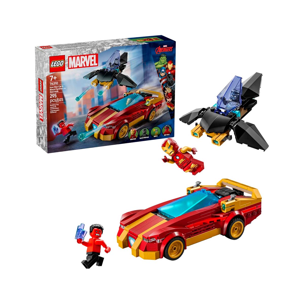 This 295-piece set includes minifigures of Iron Man, Black Panther, and Red Hulk, along with Iron Man’s robotic sidekick, Dum-E. It also features Iron Man’s sports car, equipped with two bolt-action cannons, an opening cockpit, and space to accommodate Dum-E and his fire extinguisher. Black Panther’s plane comes with two cannons, adjustable wings, and an opening cockpit with a control panel. The Red Hulk minifigure is exclusive to this set. The set offers several play features, such as stud shooters on both vehicles and movable elements, which enhance imaginative play.