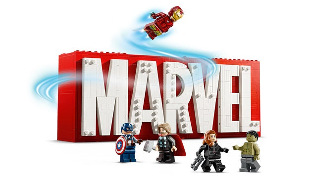 The Marvel building toy set is assembled using bold red and white bricks. Kids press 3 separate buttons on the top of the logo to make Hulk, Thor, Iron Man, Black Widow and Captain America LEGO Marvel minifigures burst from the model, bringing Avengers action to life right before their eyes. Each minifigure easily returns to its original position.