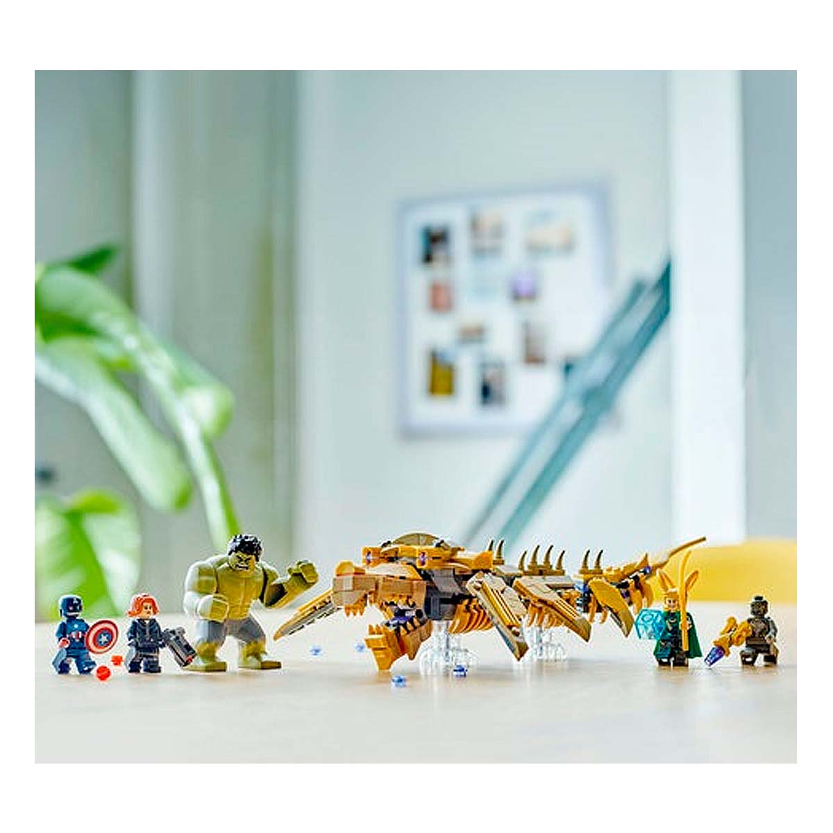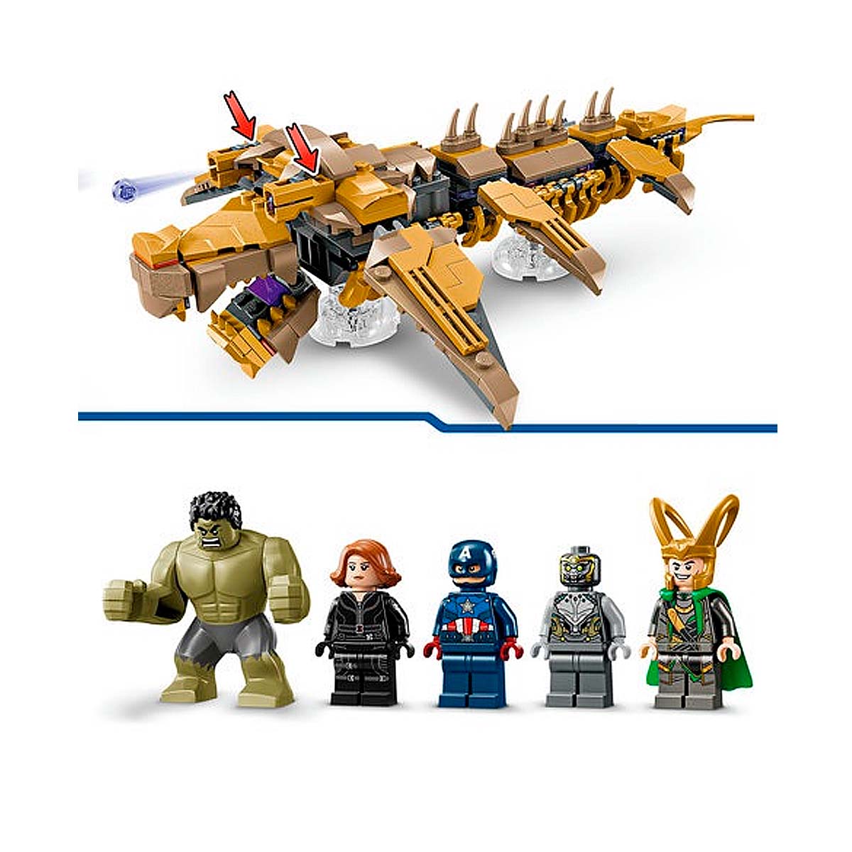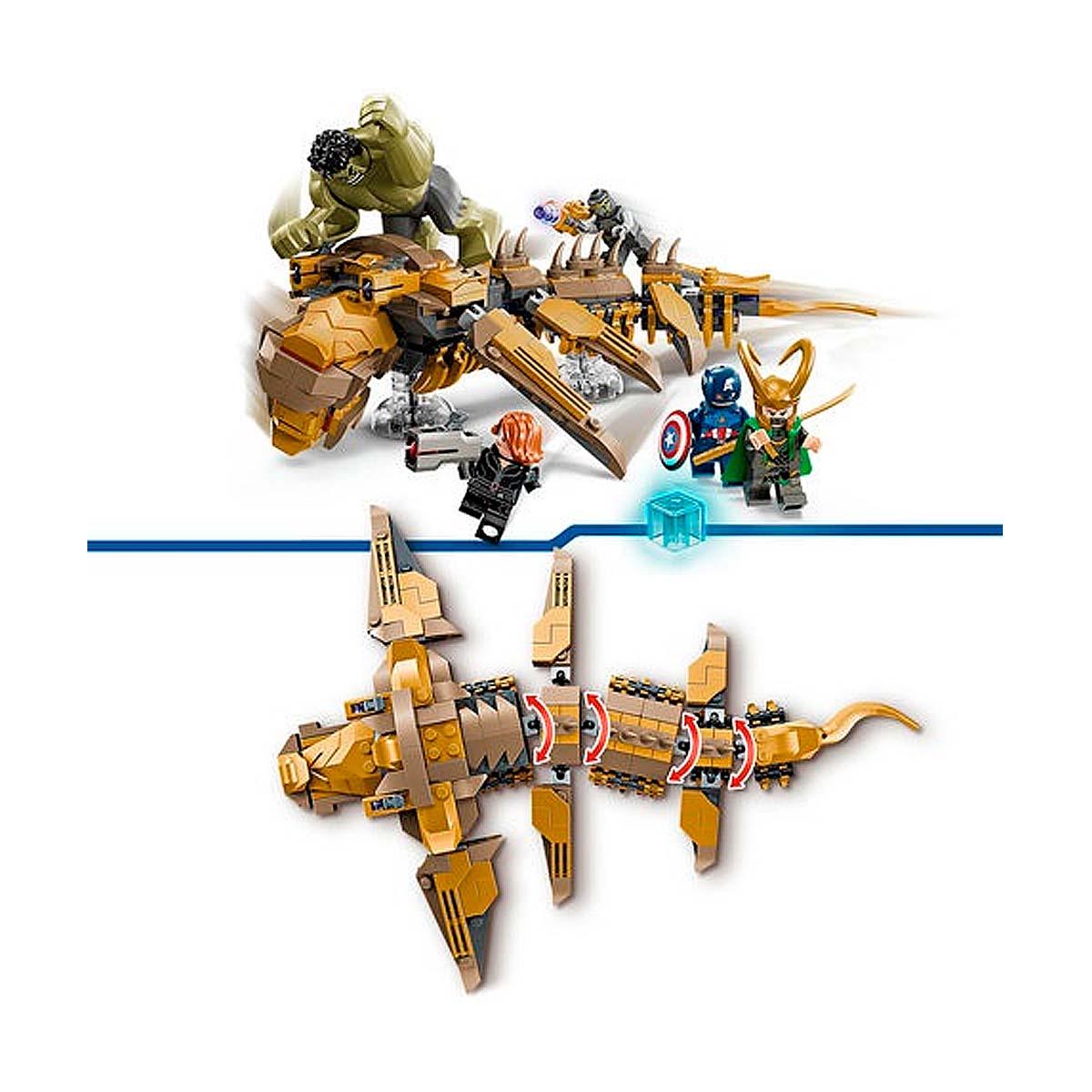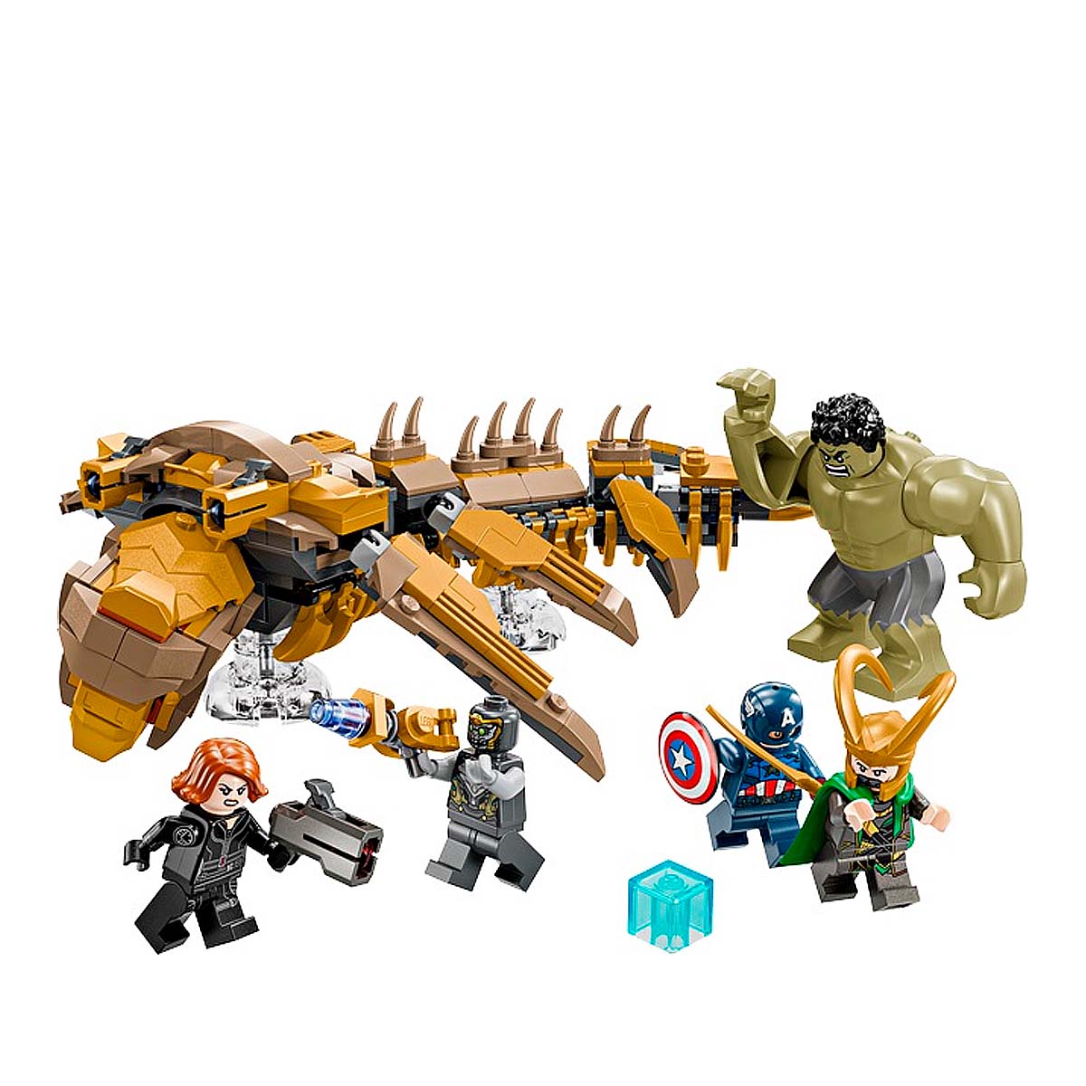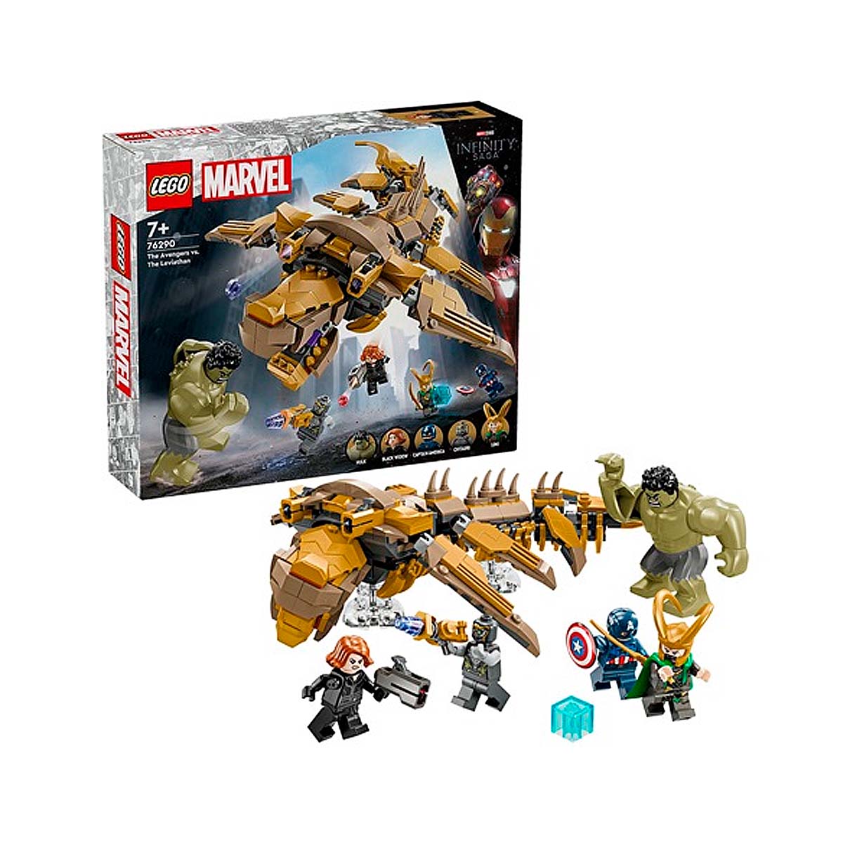 The LEGO Marvel Avengers vs. Leviathan playset (76290) recreates the final battle scene from Marvel Studios: The Avengers. Includes 4 minifigures: Captain America with his shield, Black Widow with her laser pistol, Loki with his cape and helmet, and a Chitauri warrior with his laser pistol, plus a large Hulk figure. The buildable Leviathan features 6 movable fins, a mouth that opens, a head that can turn slightly sideways and 2 cannons.