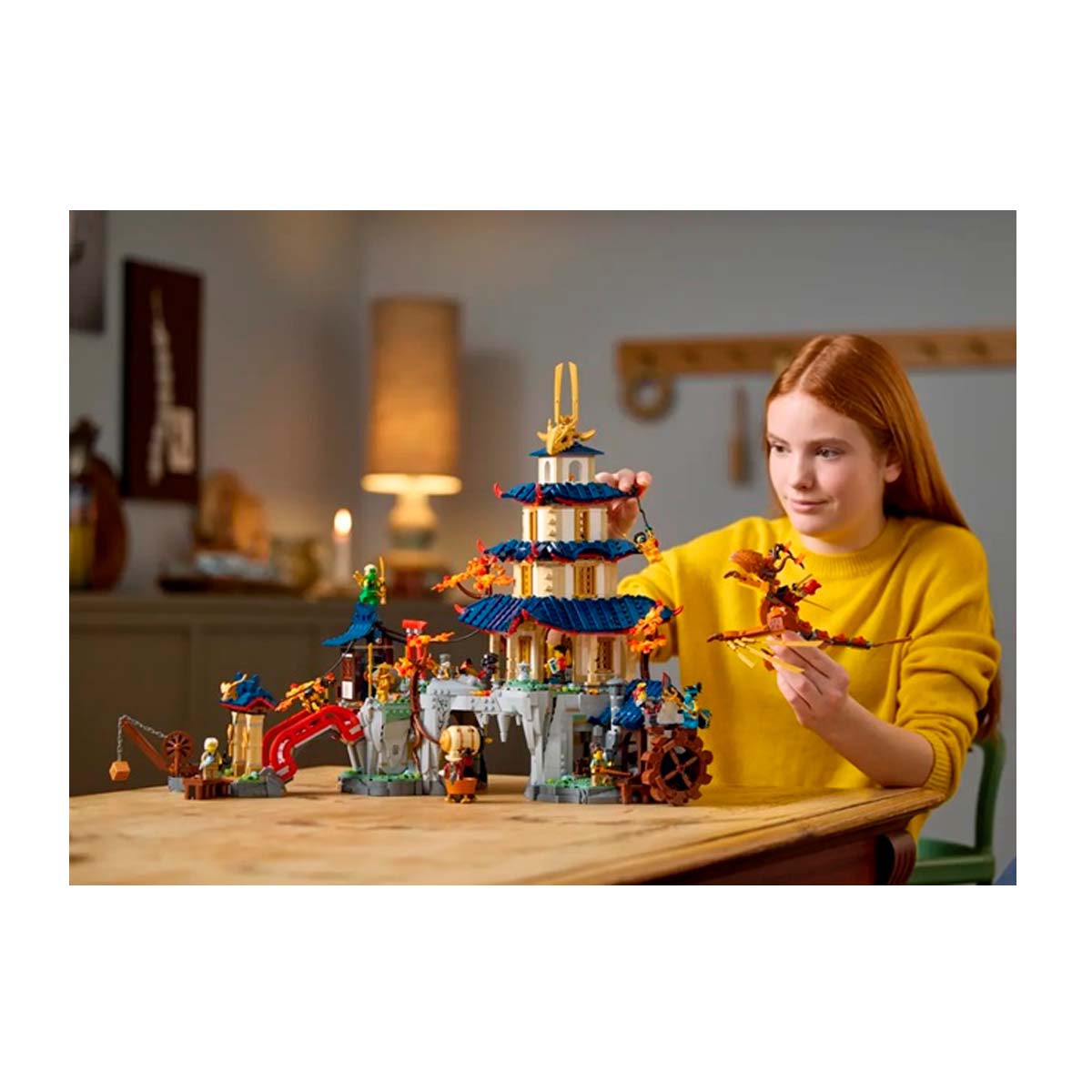- The NINJAGO temple built into a rock face features a 4-tiered pagoda, a bridge, a water mill kids can turn to move 2 battle platforms anda blacksmith’s hammer, plus falling rocks that are activated by pressing a lantern, hidden storage and a secret door. Kids can turn the temple around, where its open back provides extra play options and the chance to create fun little stories.