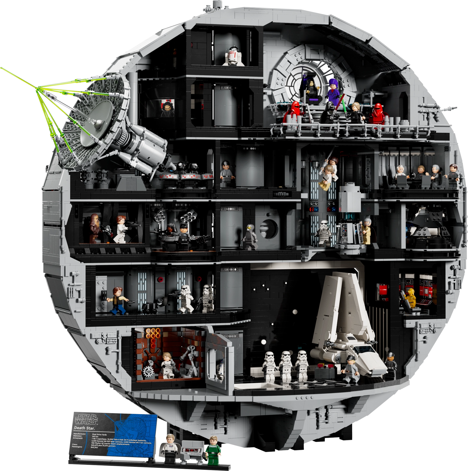 - Authentic details – The trash chute and crushing trash compactor, functional elevator, Emperor Palpatine’s throne room and Imperial Shuttle, tractor beam control unit, Superlaser and much more