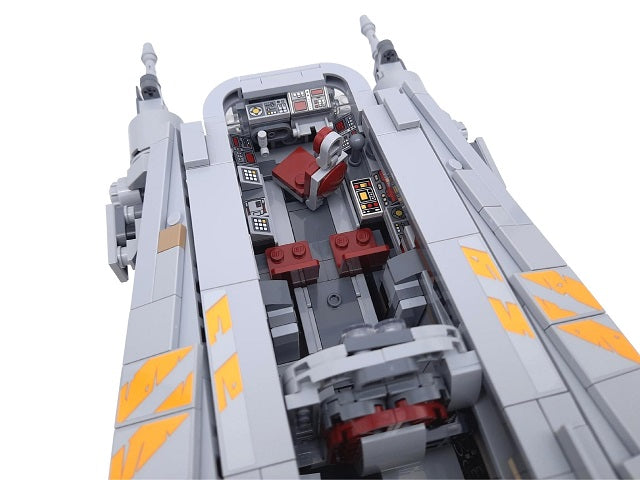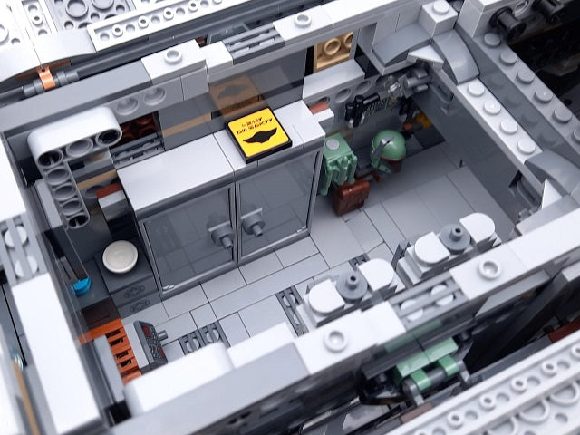 The top of the ship and its massive engines lift up for easy viewing of the detailed interior, and the cockpit is removable for access to the sleeping quarters. There are side hatches and a cargo compartment with a weapons locker, minifigure-sized carbon freezing chamber and more, plus a detachable escape pod.
