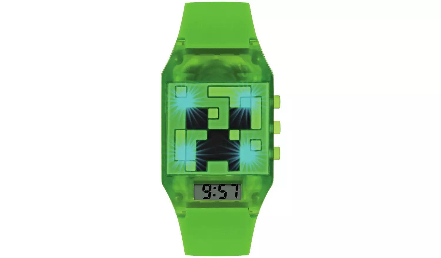 Minecraft kids watch with green plastic casing with digital display dial and green silicone strap.