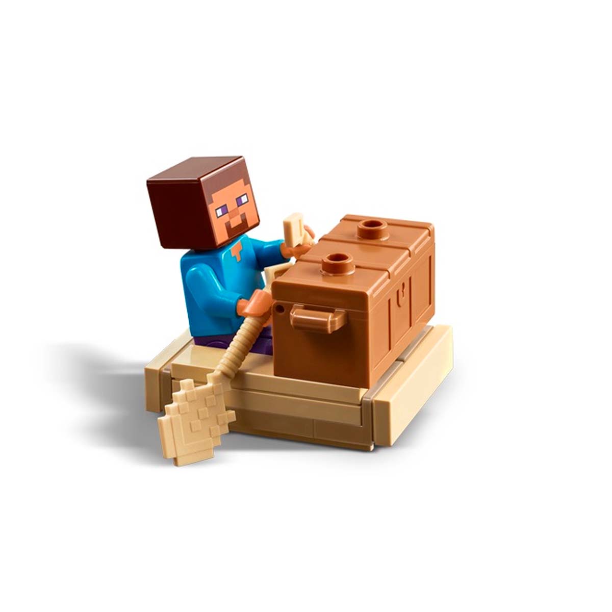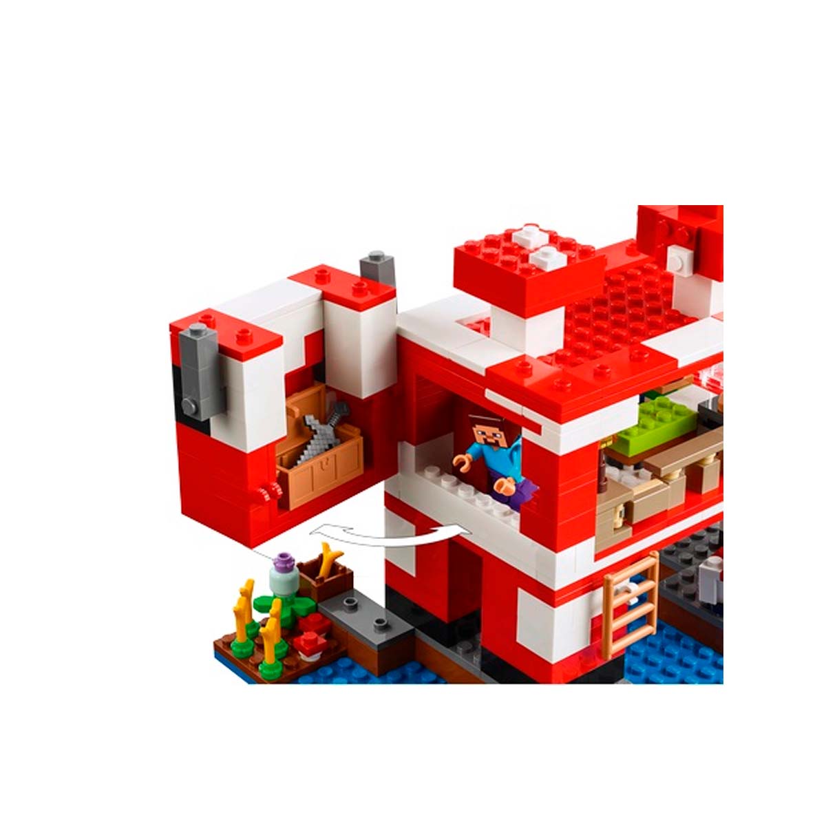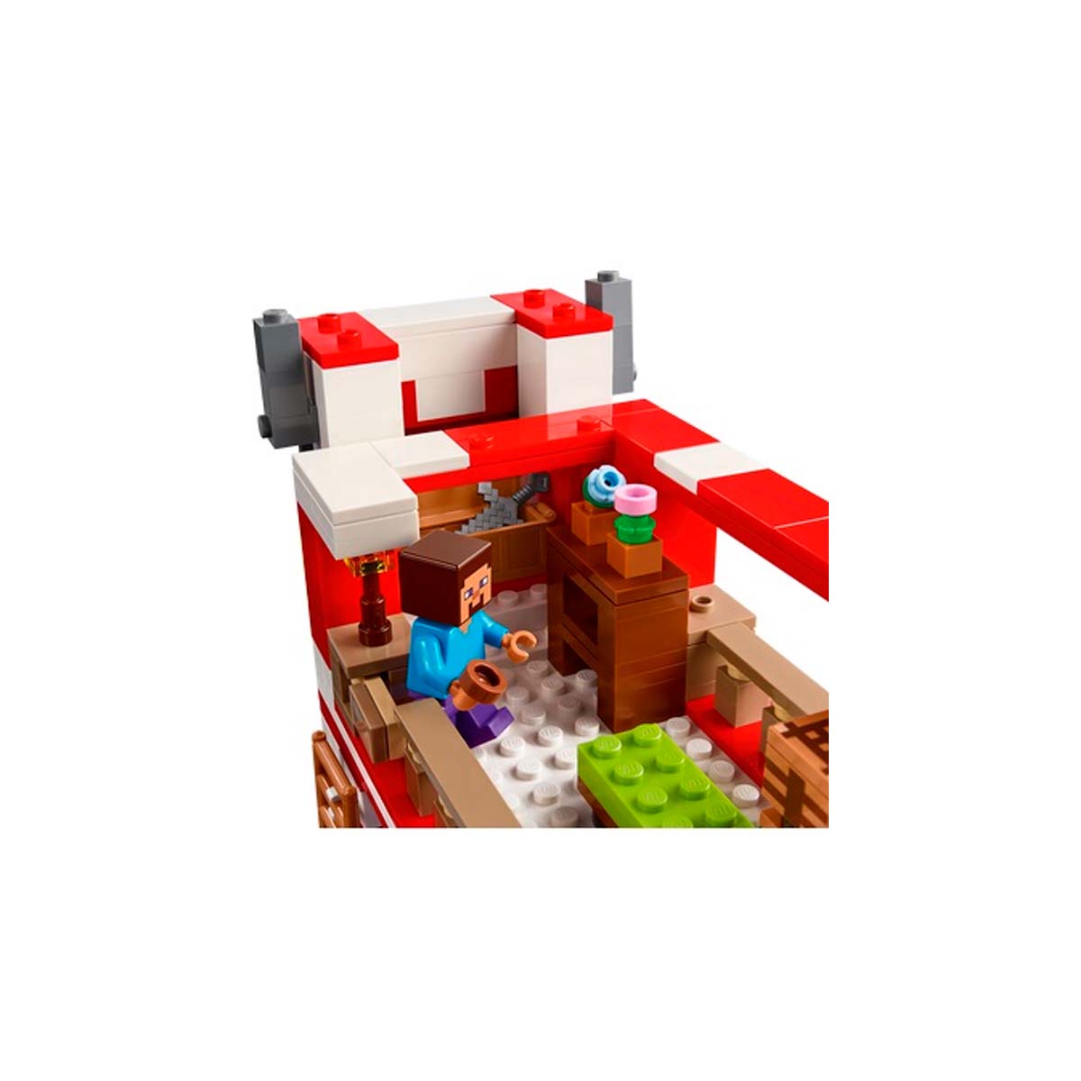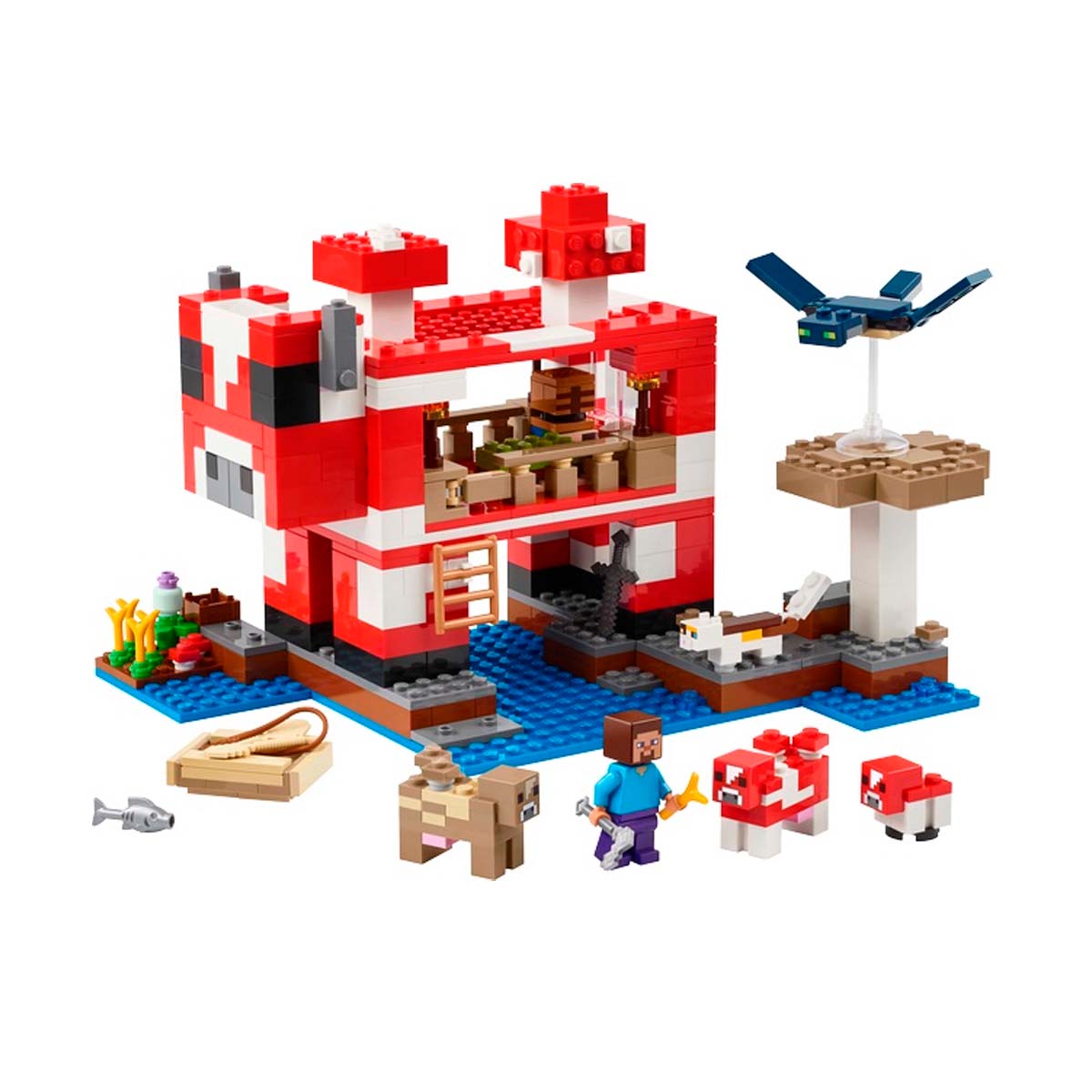 The set includes a figure of the popular character Steve, as well as a red mooshroom, a baby red mooshroom, a brown mooshroom, a calico cat and the hostile flying ghost. The Minecraft toy is packed with elements featured in the game, including a small farm area with wheat, mushrooms and a pitcher plant growing next to a composter. Accessories include a fishing rod, a cod, a hoe, a netherite sword, a bowl, a boat with oars, a chest, an oven, a craft table, a shelf, bread and a bed.