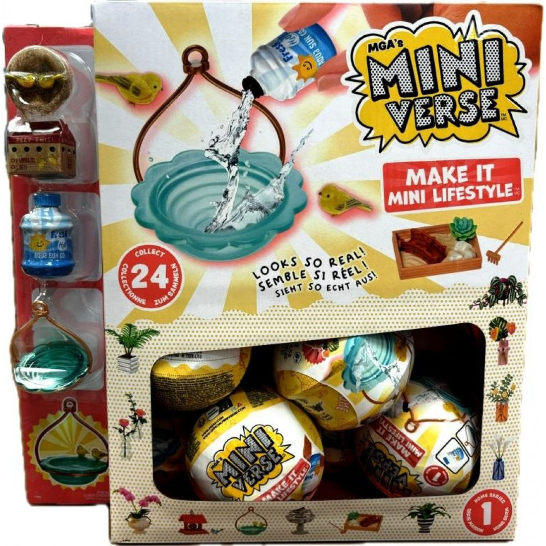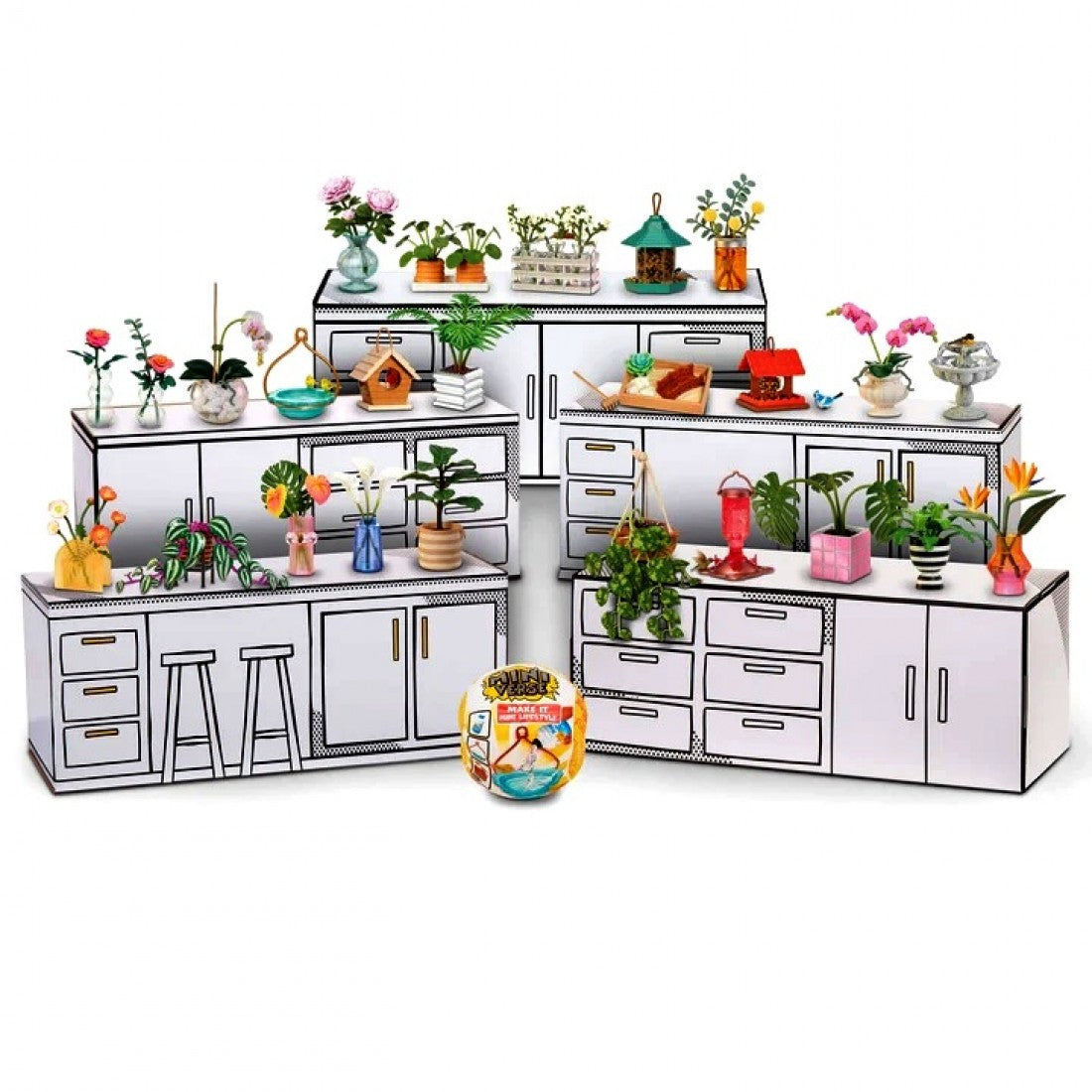 Each ball comes with miniature items and accessories to replicate your favourite lifestyle and home decor pieces. Everything from plant pots, bird houses, vases and flowers, each package is a surprise and you will not know which mini you have found until you unbox it.