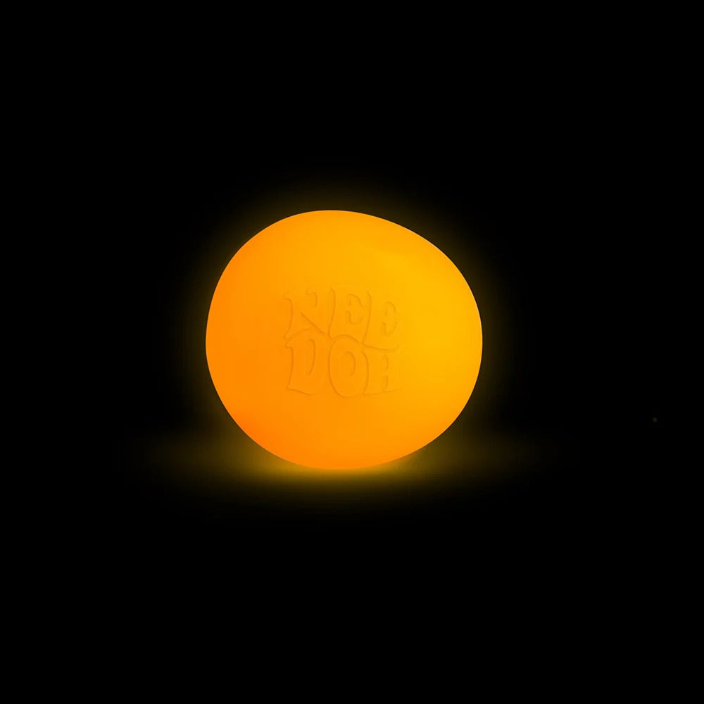 - Switch off the lights and watch your groovy glob pop! Glow In The Dark NeeDoh is a dazzling stress toy that comes in five bright neon colours, including purple, pink, blue, green and orange. Colours are chosen at random and may vary.