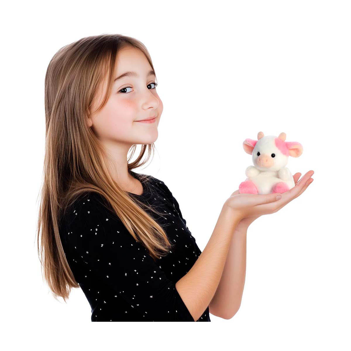 - Pink and white plush with bean filling; compact size that fits in the palm of your hand.