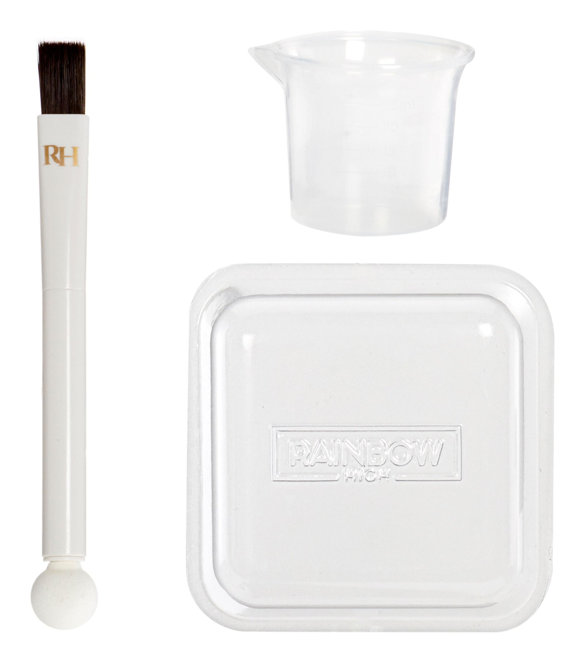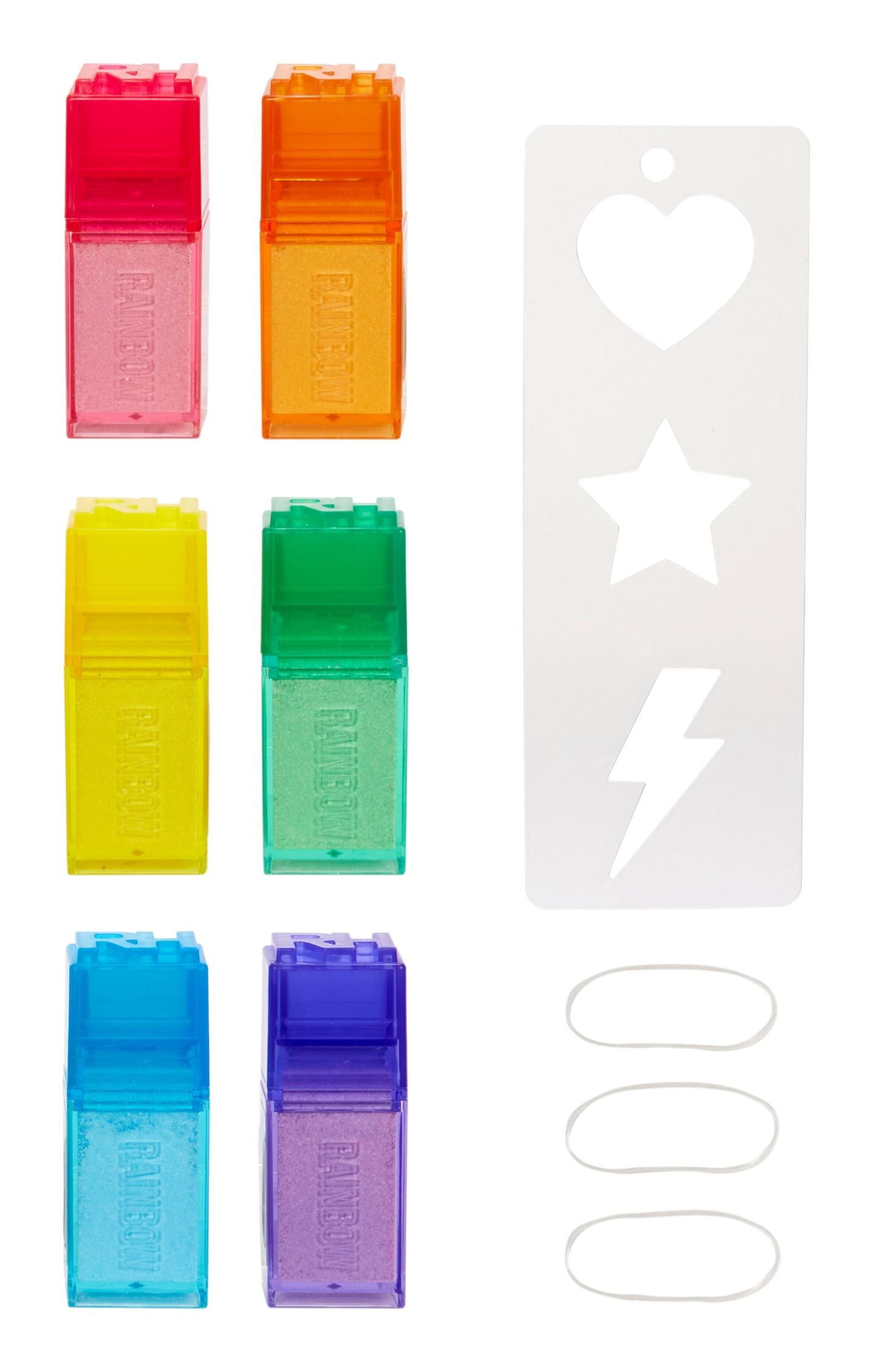 - Add water to the six rainbow-coloured powders to create watercolours, then dip onto clothes and hair.