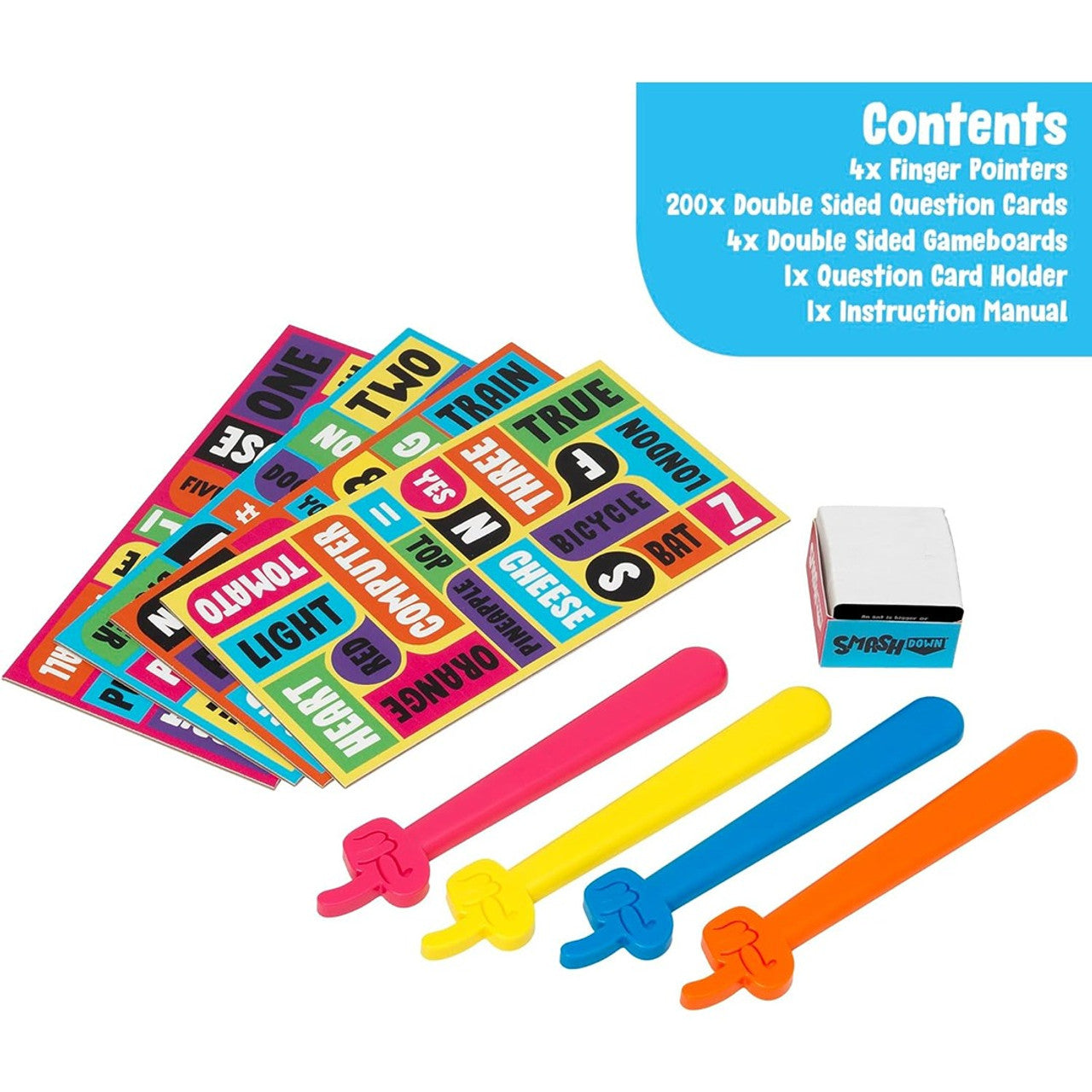 Think! Find! Smash! The fast-paced quiz game where everyone knows the answer, but the winner is the first to find it and smash it. Who Has The Fastest Finger? A modern version of the familiar trivia game without long and boring rules. The quiz master reads out a question card and players must race to smash the answer on the game boards using their finger pointer and shout ‘Smash it’.