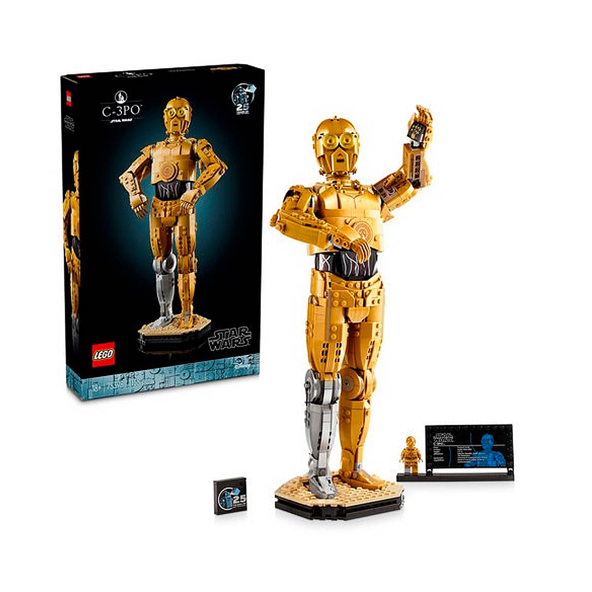 Build and display this detailed LEGO Star Wars C-3PO figure (75398). Recreate every detail of the beloved Star Wars character and turn his head or move his arms to create familiar poses. Includes a stand with a C-3PO nameplate and space for the included LEGO Star Wars C-3PO minifigure, plus a LEGO Star Wars 25th Anniversary brick to complete an eye-catching centrepiece.