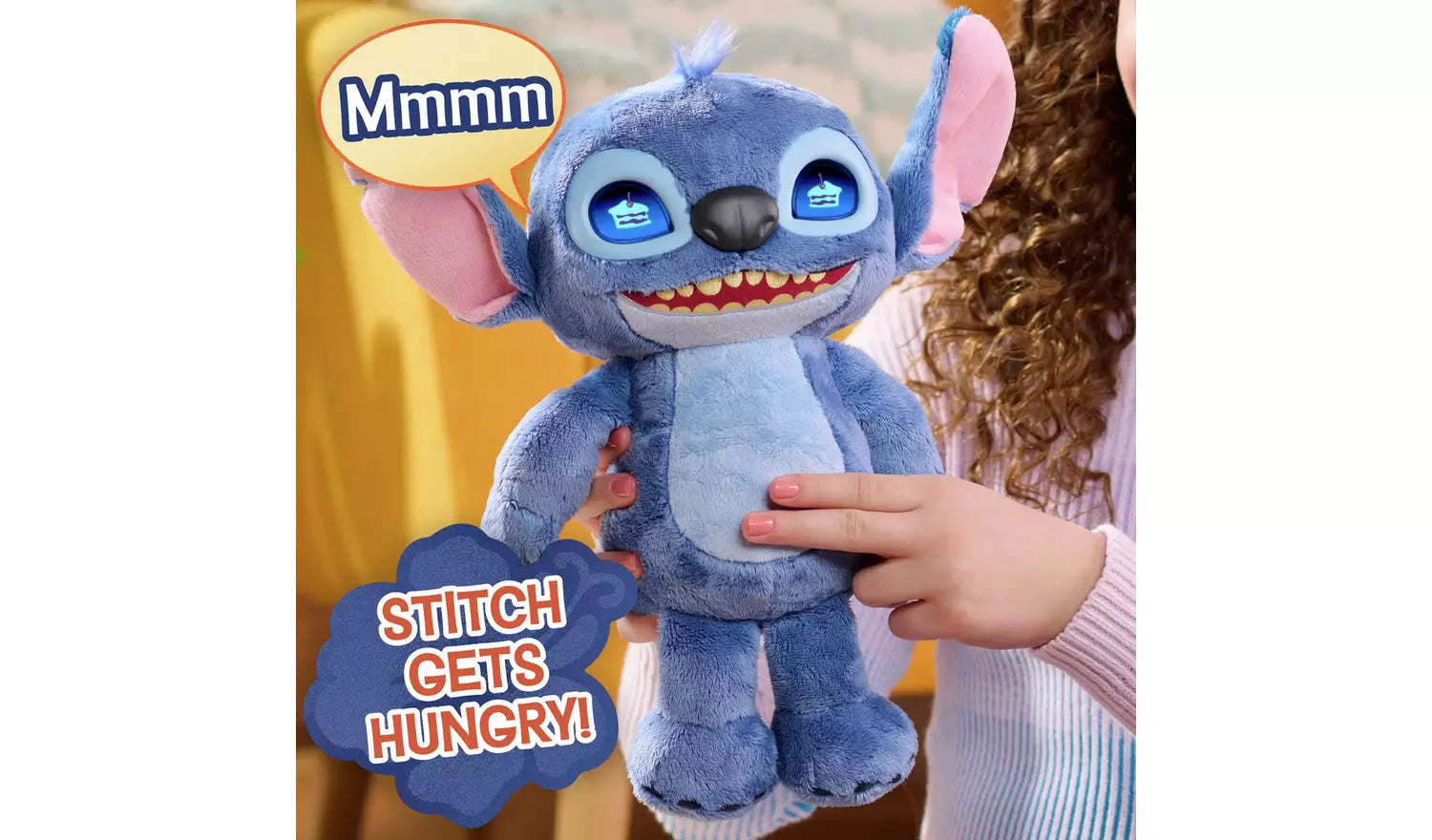 The Many Moods Stitch interactive plush toy, inspired by Disney's live-action film Lilo & Stitch, brings the lovable alien character to life. This 14’ plush toy has LCD eyes and more than 50 sounds and reactions. He activates different moods by changing modes, with playful actions such as scratching his head, rubbing his tummy and bending over. Stitch also responds when ‘fed’ or bounced with funny phrases, sound effects and eye animations. When he's ready to sleep, gentle rocking elicits yawns and eye-closing.