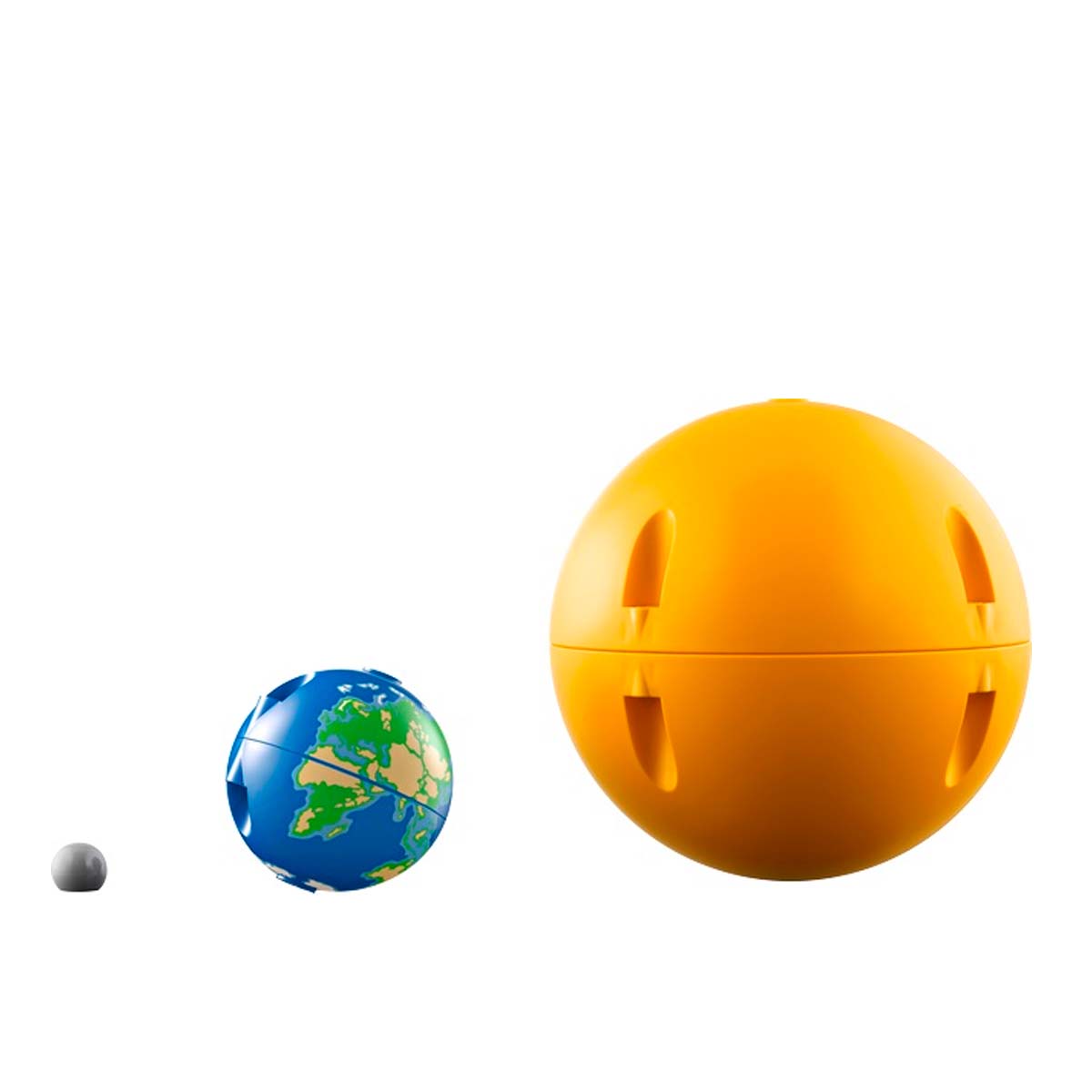 The interactive set makes it easy to understand different concepts such as the orbit of the Earth and Moon, the Earth's gravitational pull and how rotations affect the seasons. It includes a crankshaft that can be turned to create the rotations. There are also months and moon phases printed to show the progress of the Earth, Sun and Moon throughout the year.