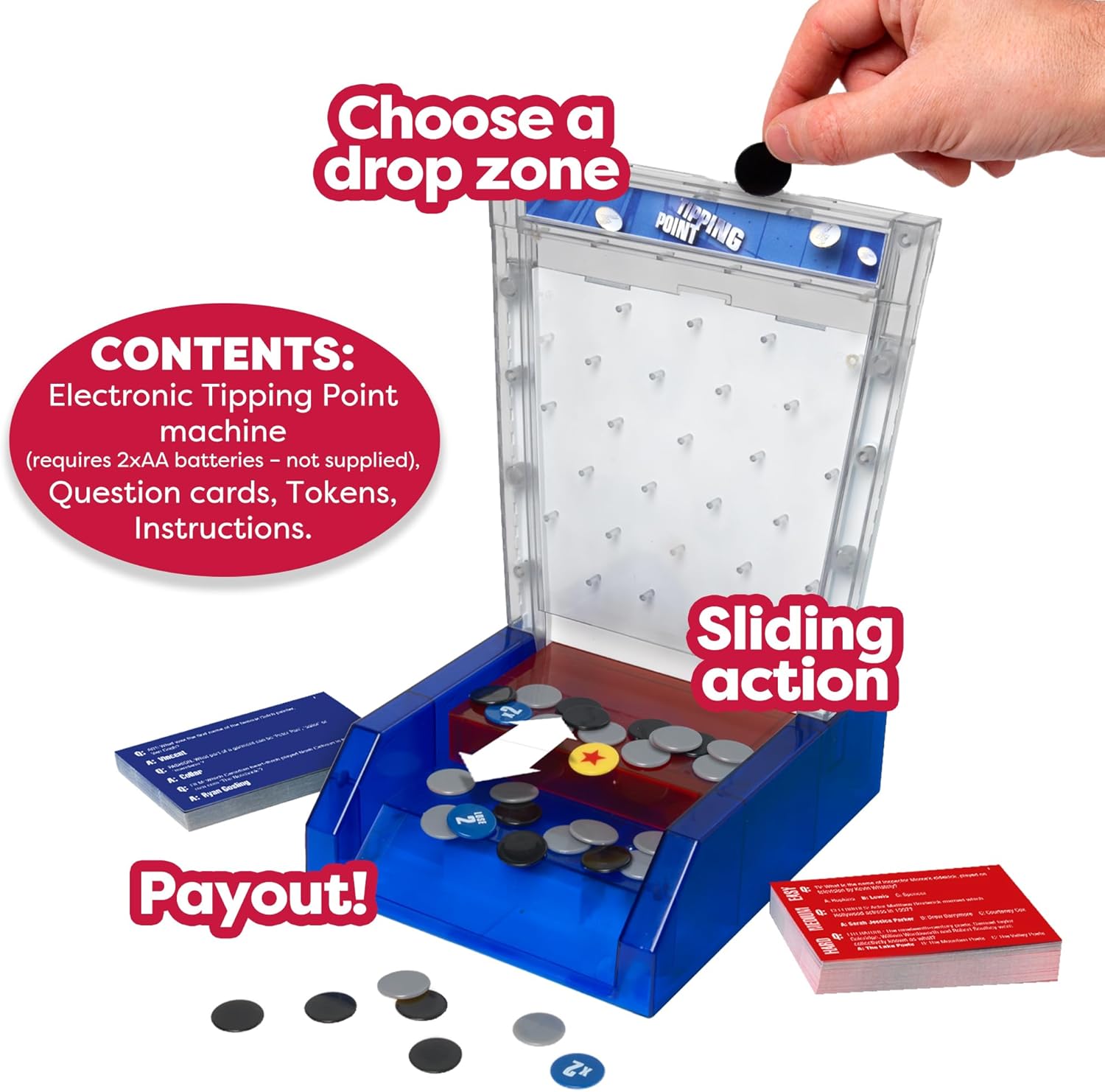 Compete with friends and family in teams or individually in this general knowledge quiz game. Tipping Point is based on the popular TV show - a high-level quiz game for everyone! Answer the questions correctly to win tokens that you can deposit into the electronic Tipping Point machine. Guess which of the four drop zones will give you the biggest prize and see if you can start a chain reaction that triggers a box.