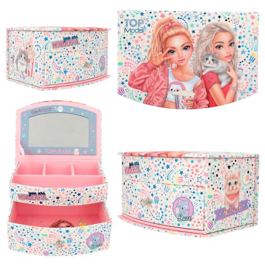 For private treasures: The small TOPModel Cutie Star jewellery box with super cute star allover, fun popcorn icons, cute kittens and a stylish model print has a mirror in the flap lid, a divided main compartment and a large drawer with a rhinestone on the button.