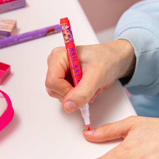 For nail artwork: With the nail polish pens from TOPModel you can paint fine patterns or shapes on the nail. There are two nail polish pens in each set: peach-coloured and purple. The nail polish is water-based.