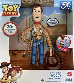 - Hey, howdy, hey! This Roundup Fun Woody doll from Disney and Pixar's Toy Story brings home the adventure and friendships of the movies. Just pull the tab on his back to hear 30+ phrases.