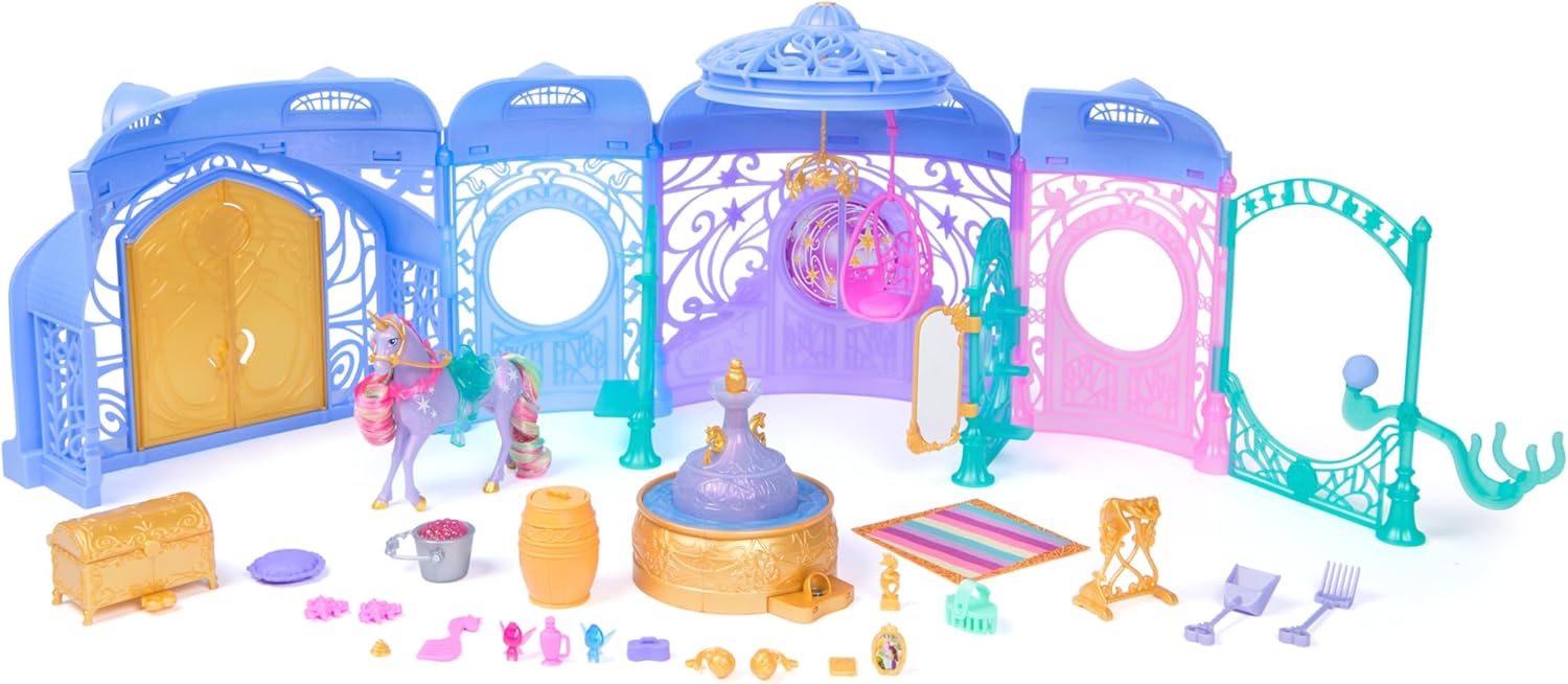 - Unicorn stable: Based on the popular NETFLIX show and best-selling kids’ books, this playset brings the unicorn stables to life, featuring a light-up fountain, exclusive 13cm Wildstar and 24 accessories