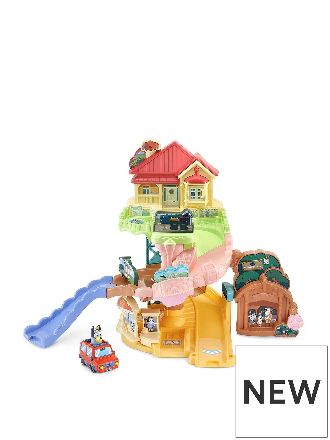 - VTech Bluey road trip playset featuring driving tracks from Heeler house to beach and school
